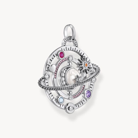 A Miniature Universe in Silver - Inspired by celestial motion and symbolic astrology, this intricately crafted pendant brings cosmic harmony to life. A radiant half-moon centerpiece, adorned with sparkling zirconia, rests within a circle of white cold enamel.