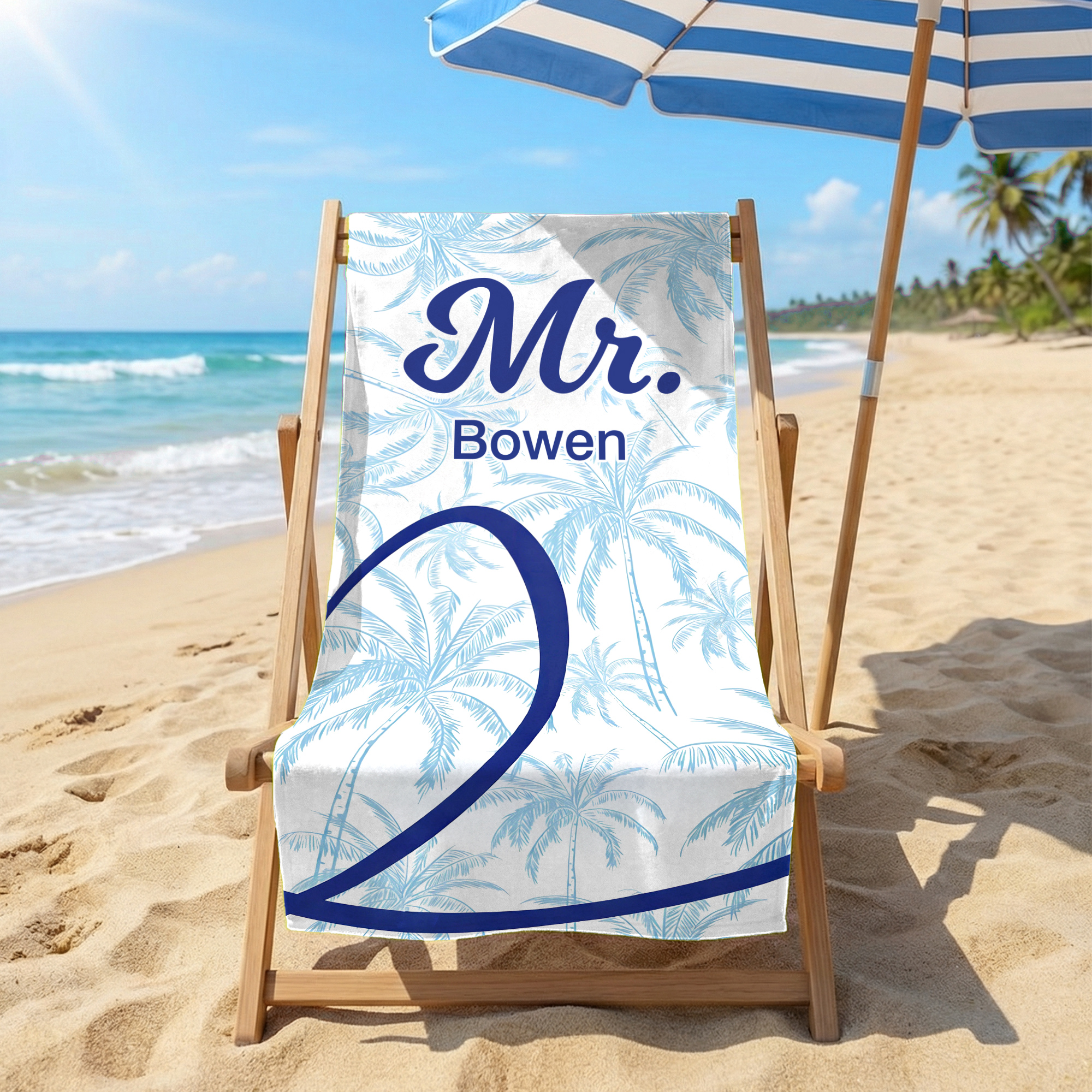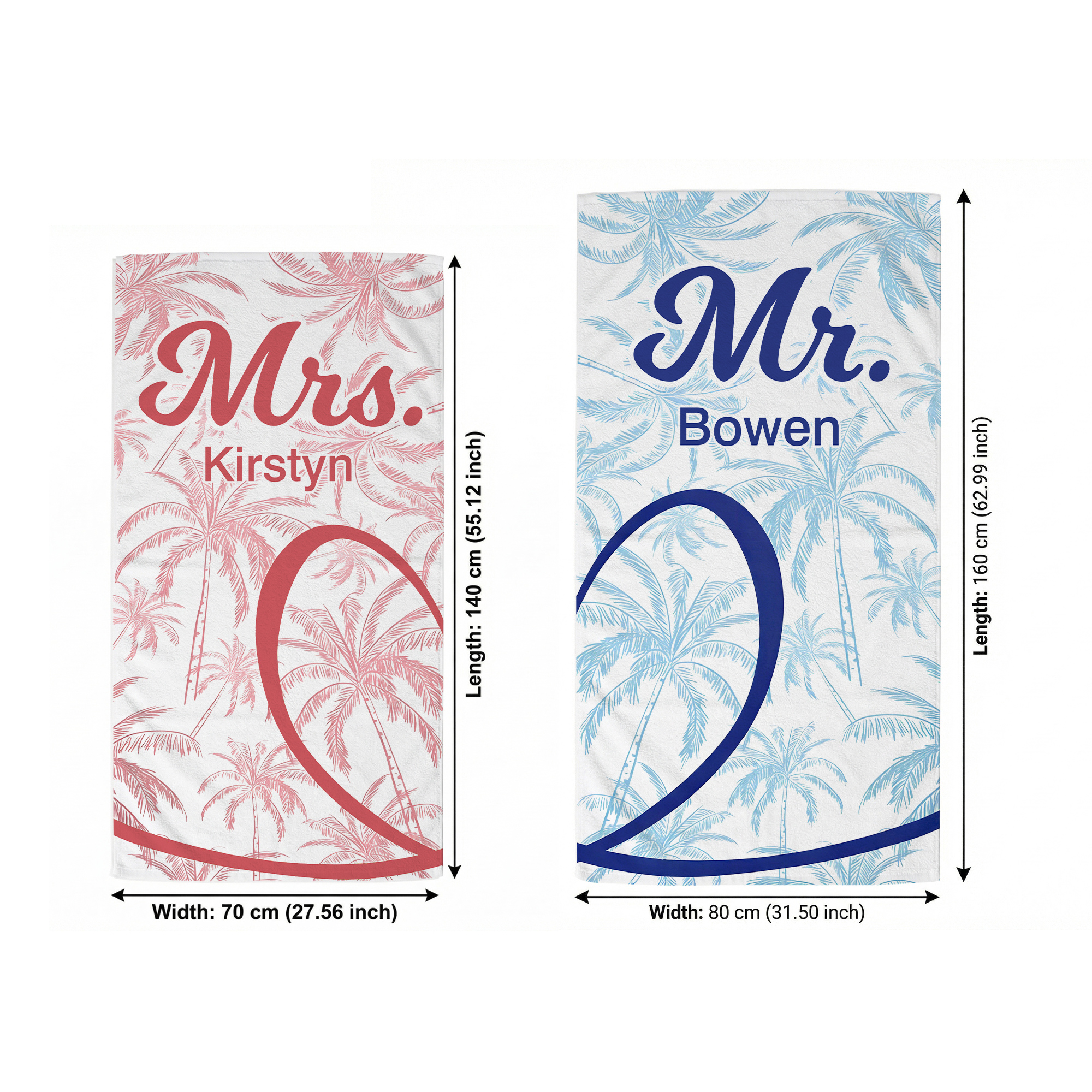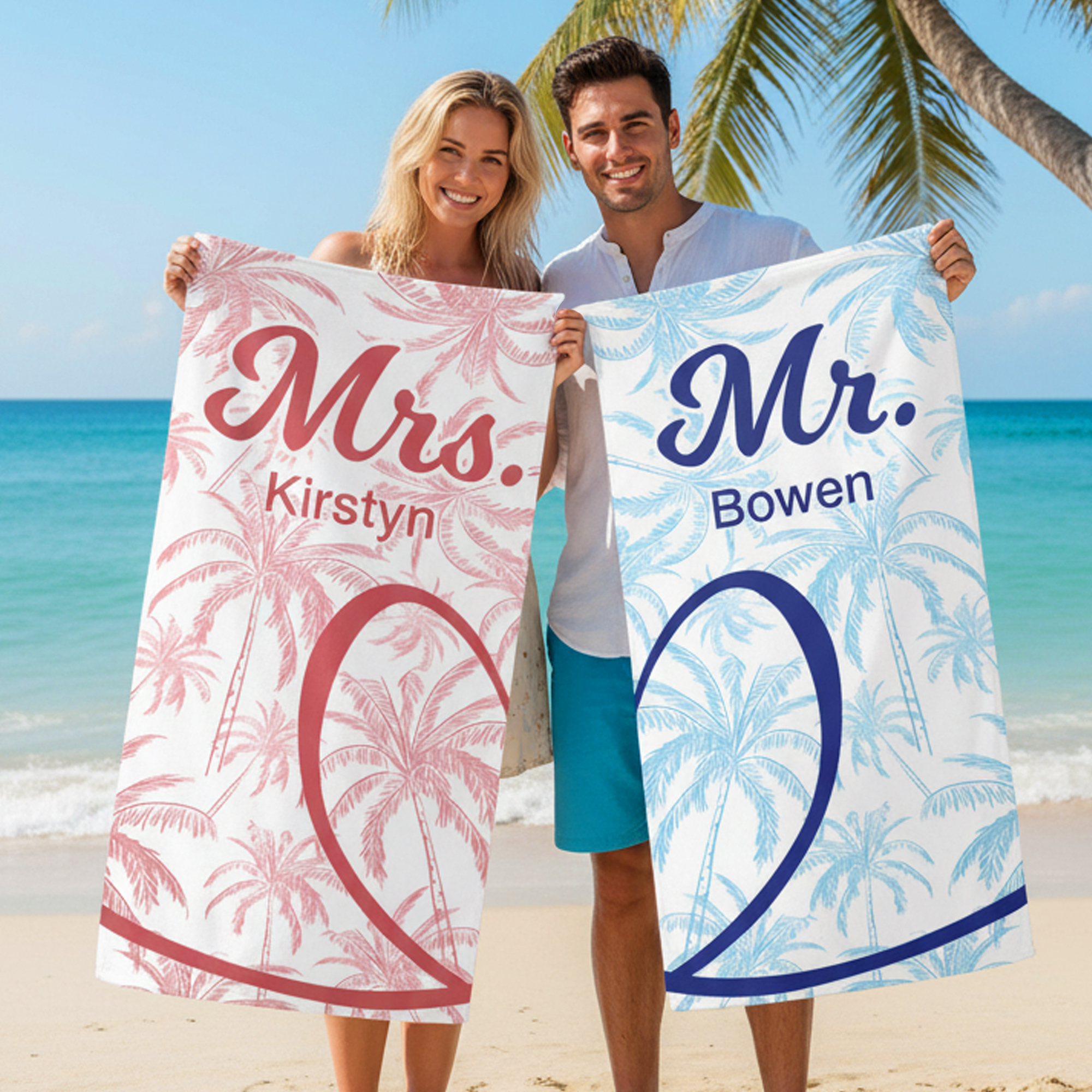 Half-Heart Couple Design - This beach towel showcases a charming half-heart pattern in pink and blue, creating a coordinated look for couples. When placed together, the two halves form a complete heart, while the palm tree design adds a fun tropical vibe. Personalized names can be added, and the matching “Mr.” and “Mrs.” details create a sweet and stylish couple theme that stands out during summer outings.