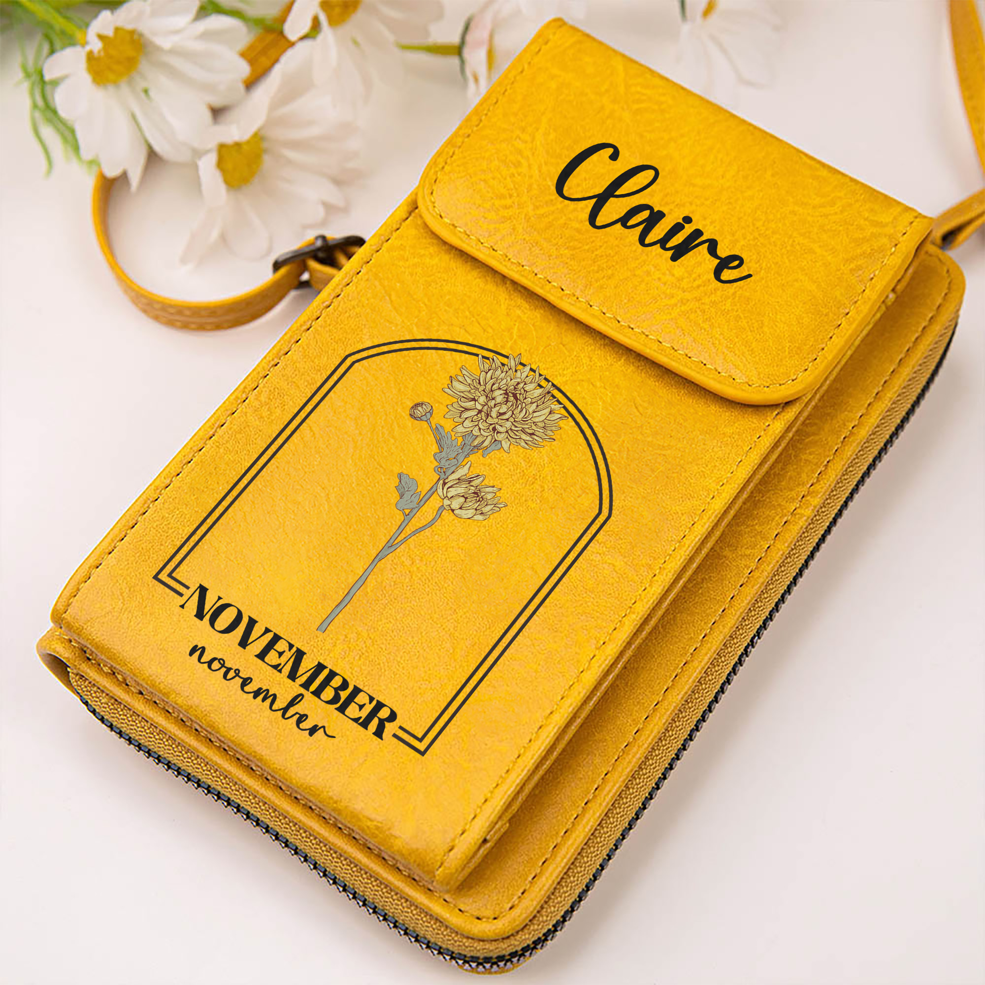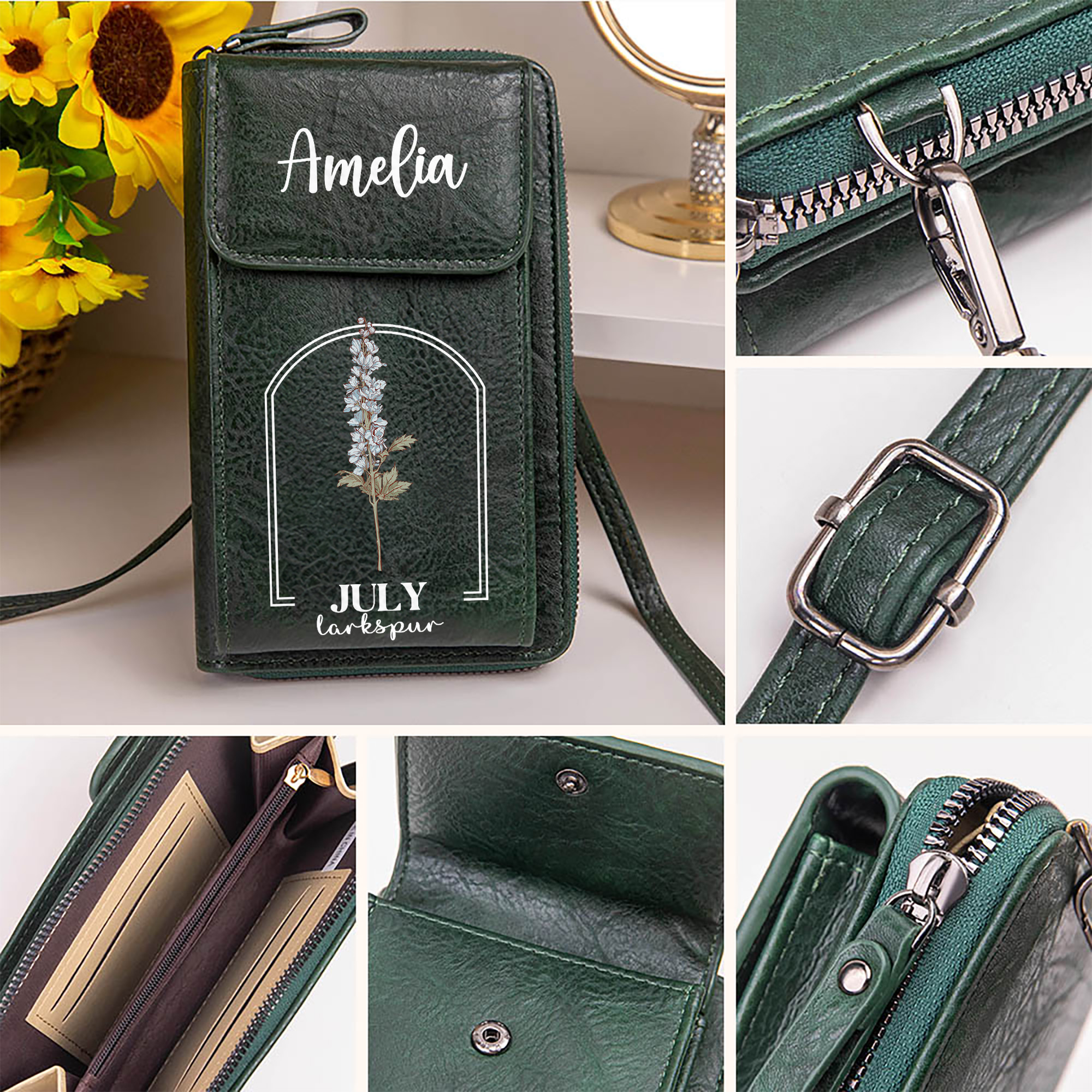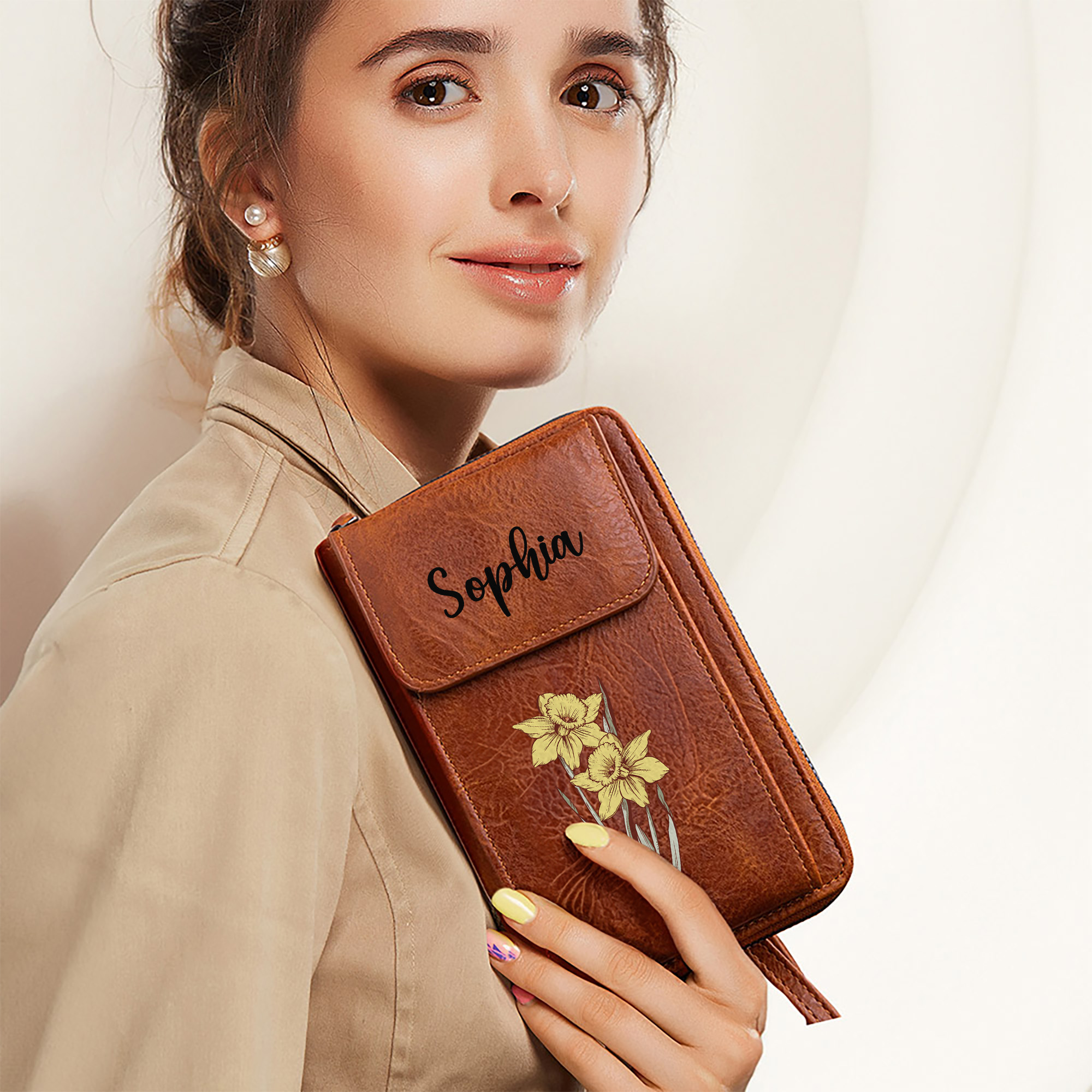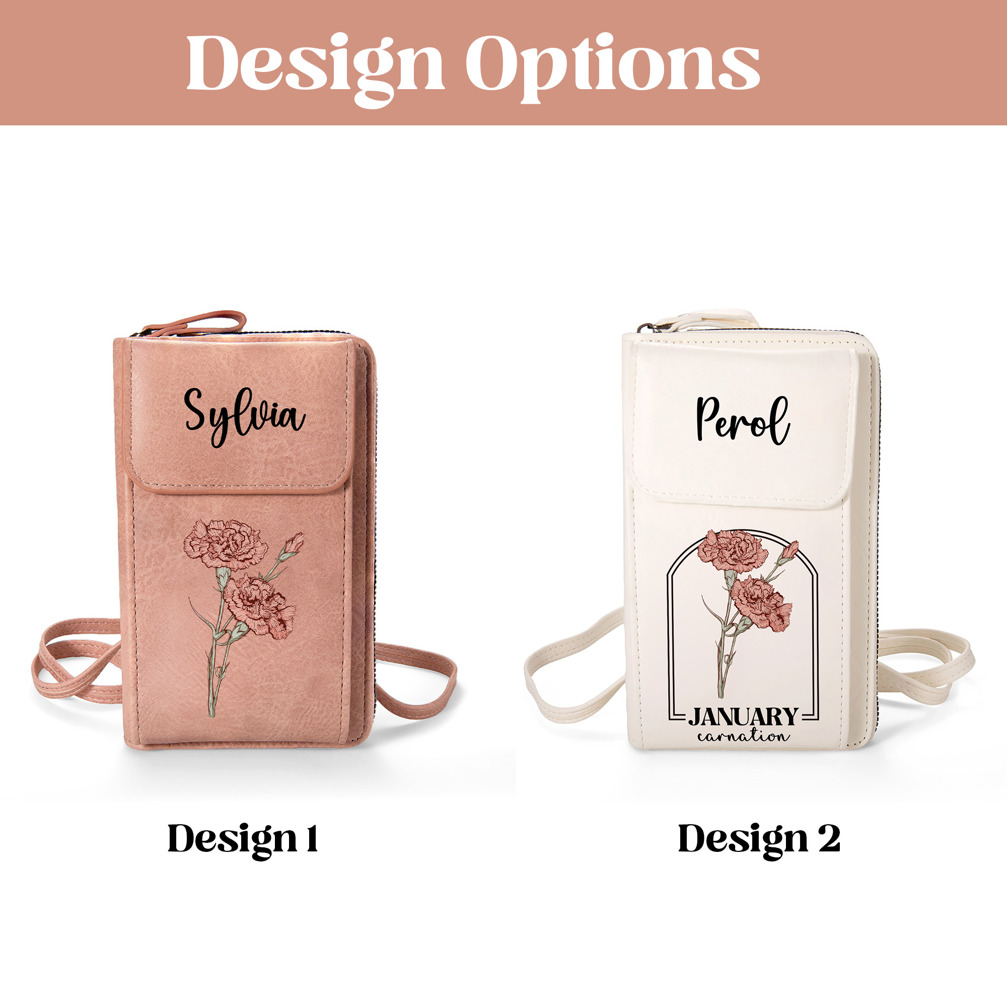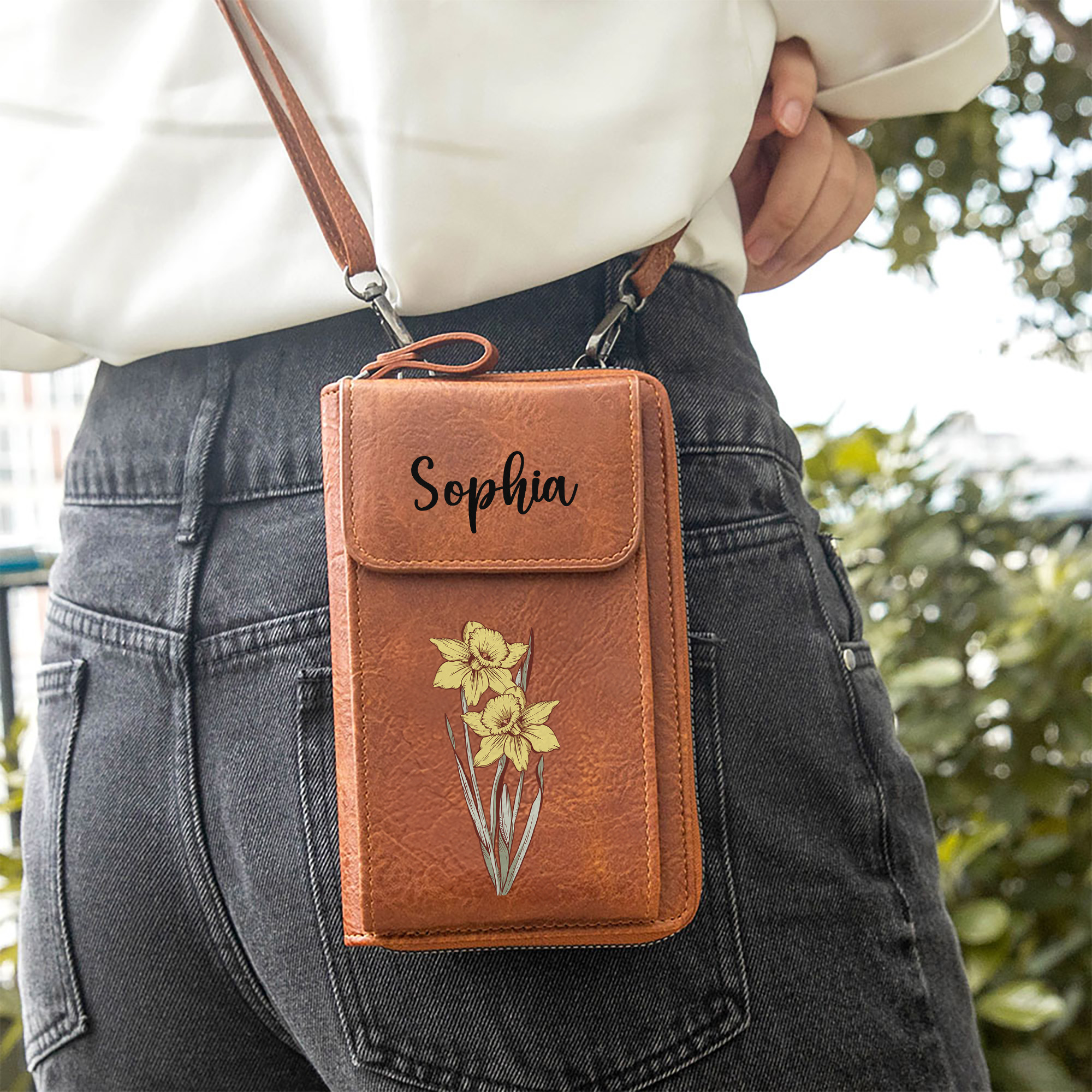 Custom Name Birth Flower Crossbody Cellphone Bag, Leather Phone Wallet Purse with Adjustable Strap, Mother's Day/Birthday Gift for Her/Mom/Besties