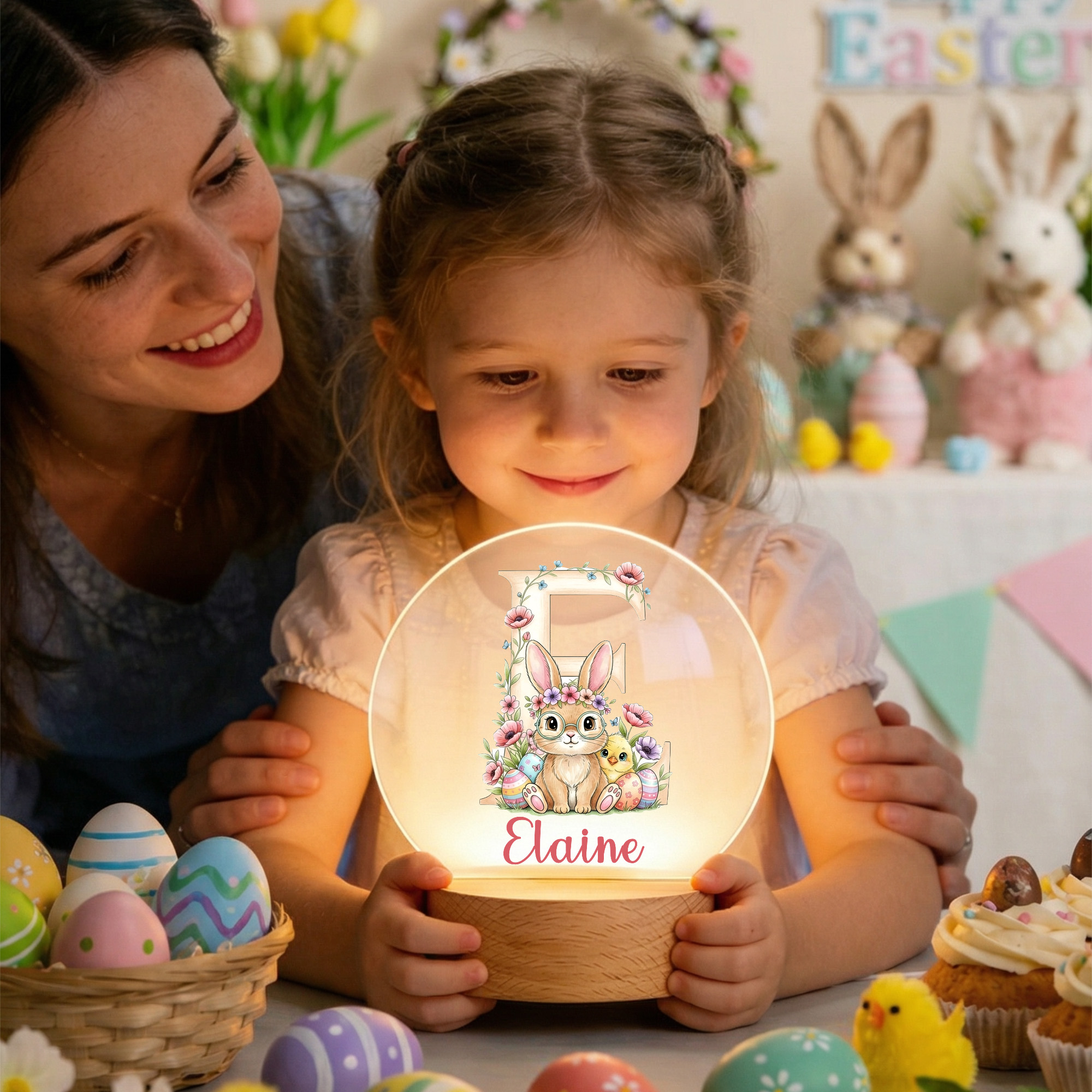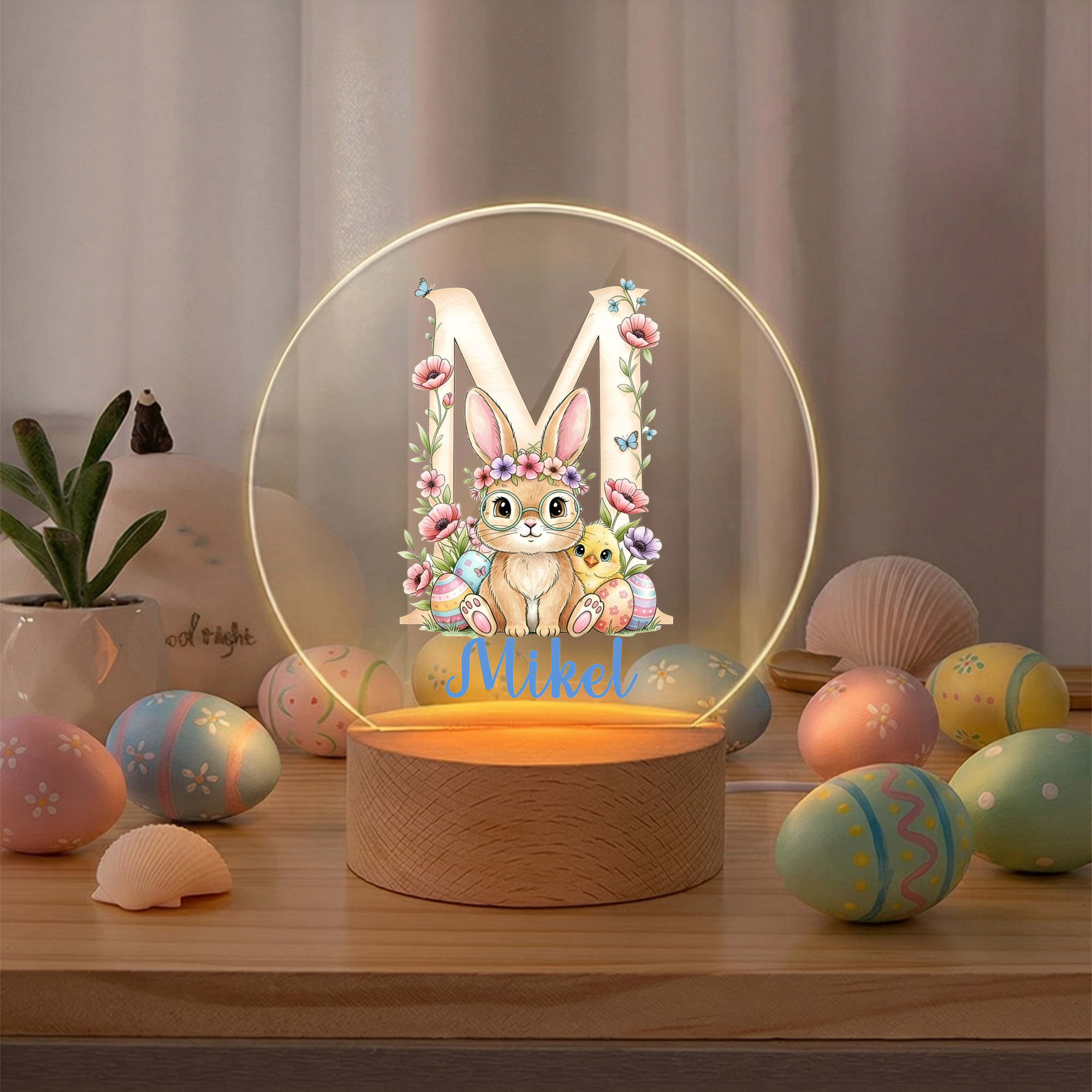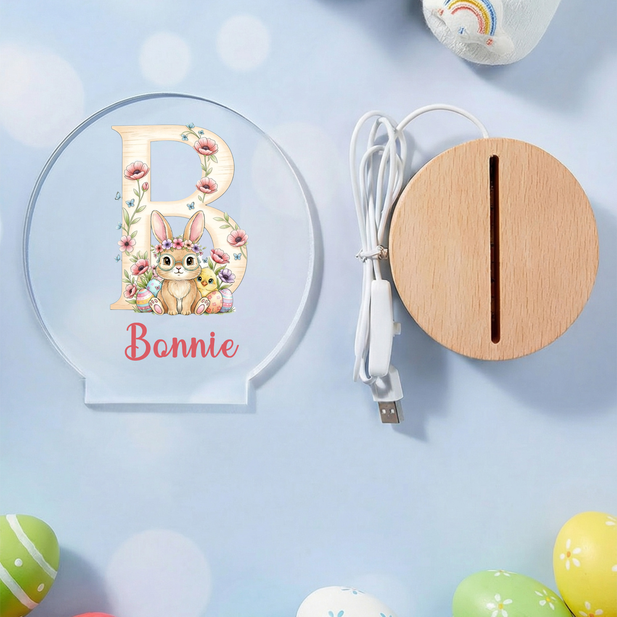 Custom Name Bunny & Floral Alphabet LED Night Light, Acrylic Night Lamp with Wooden Base, Nursery Home Decor, Birthday/Easter Gift for Kids/Boys/Girls