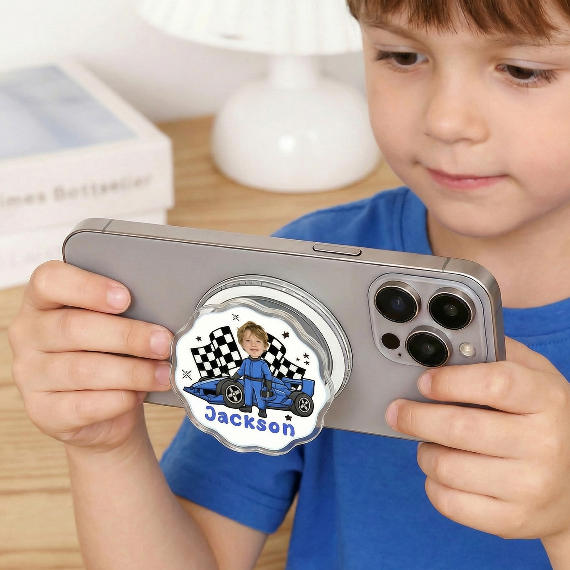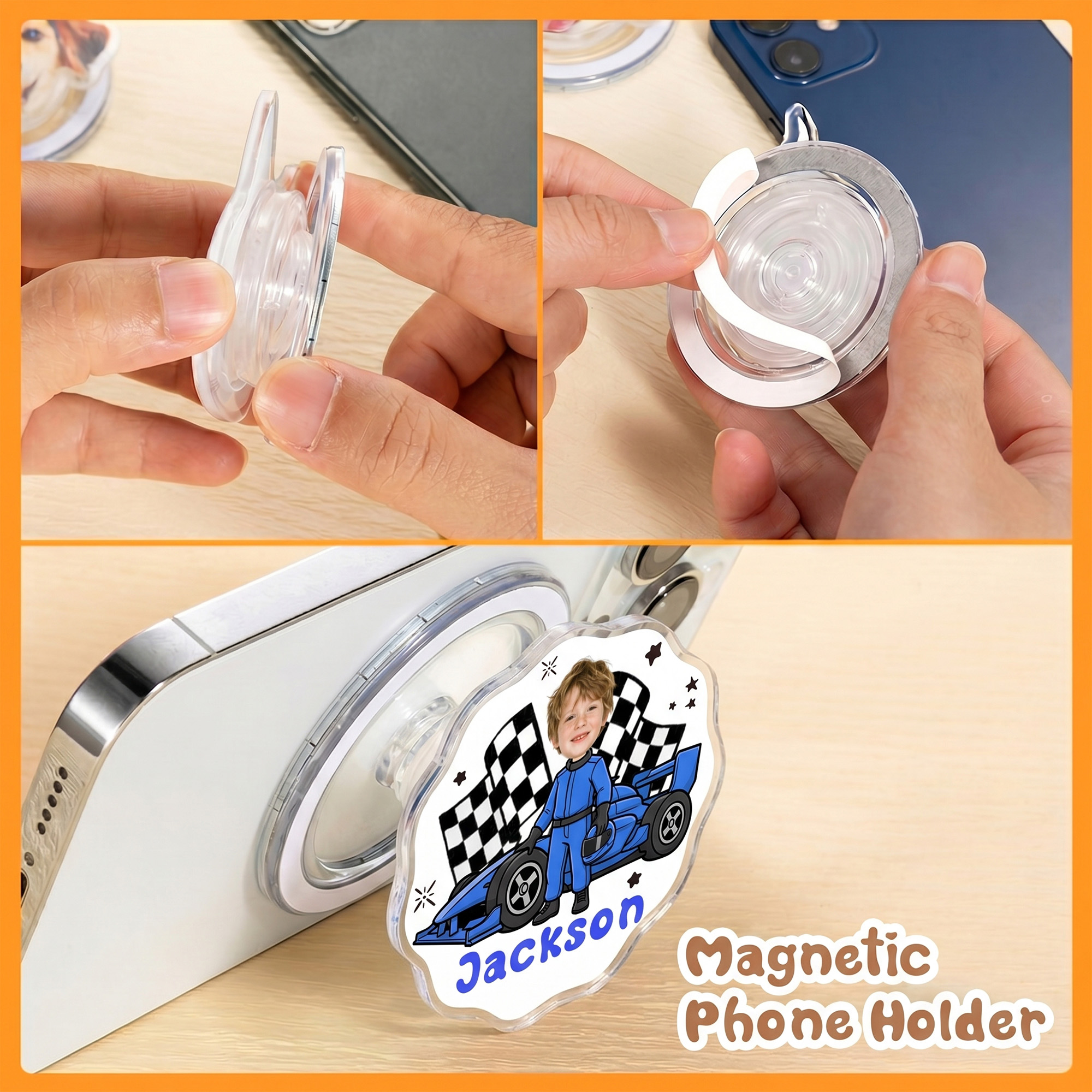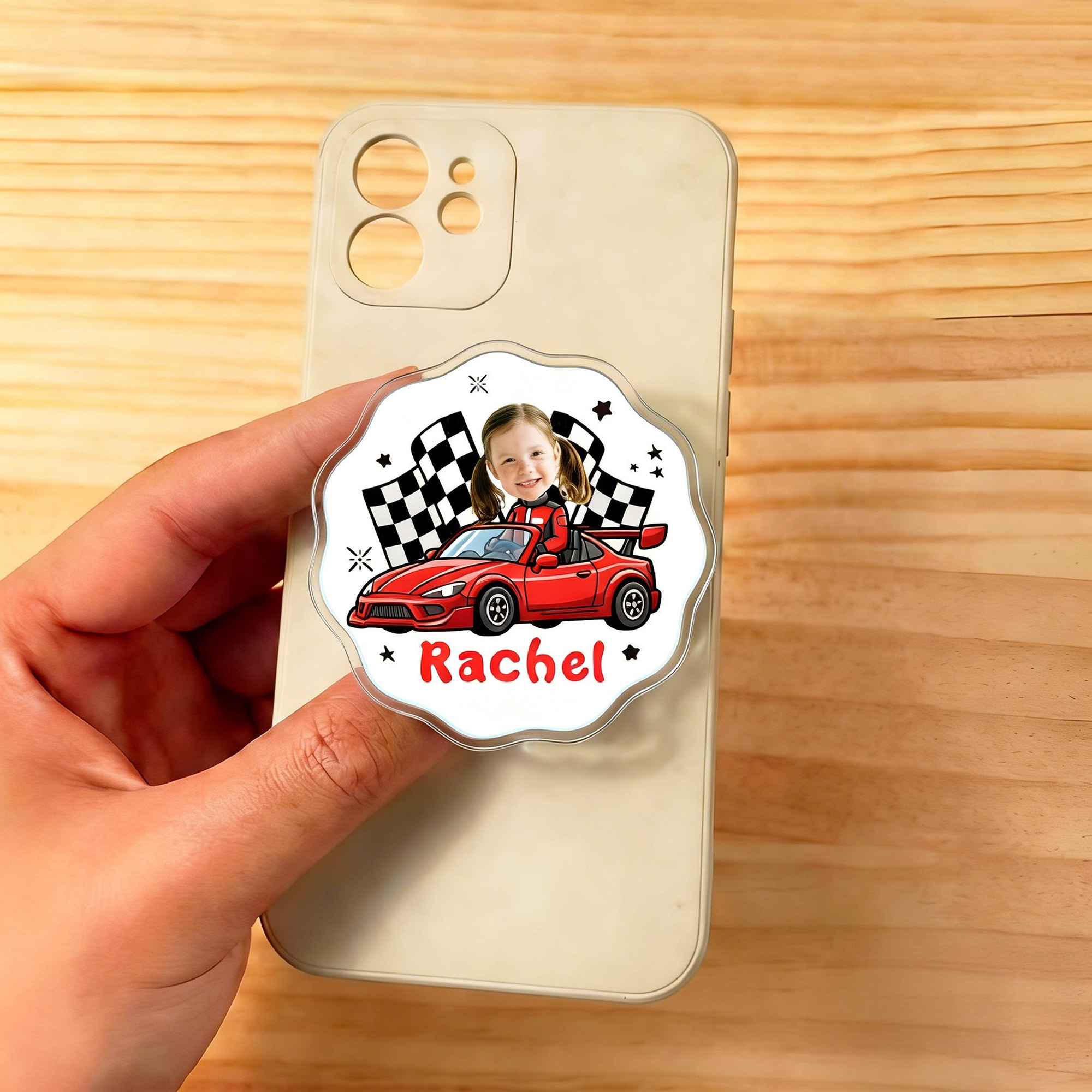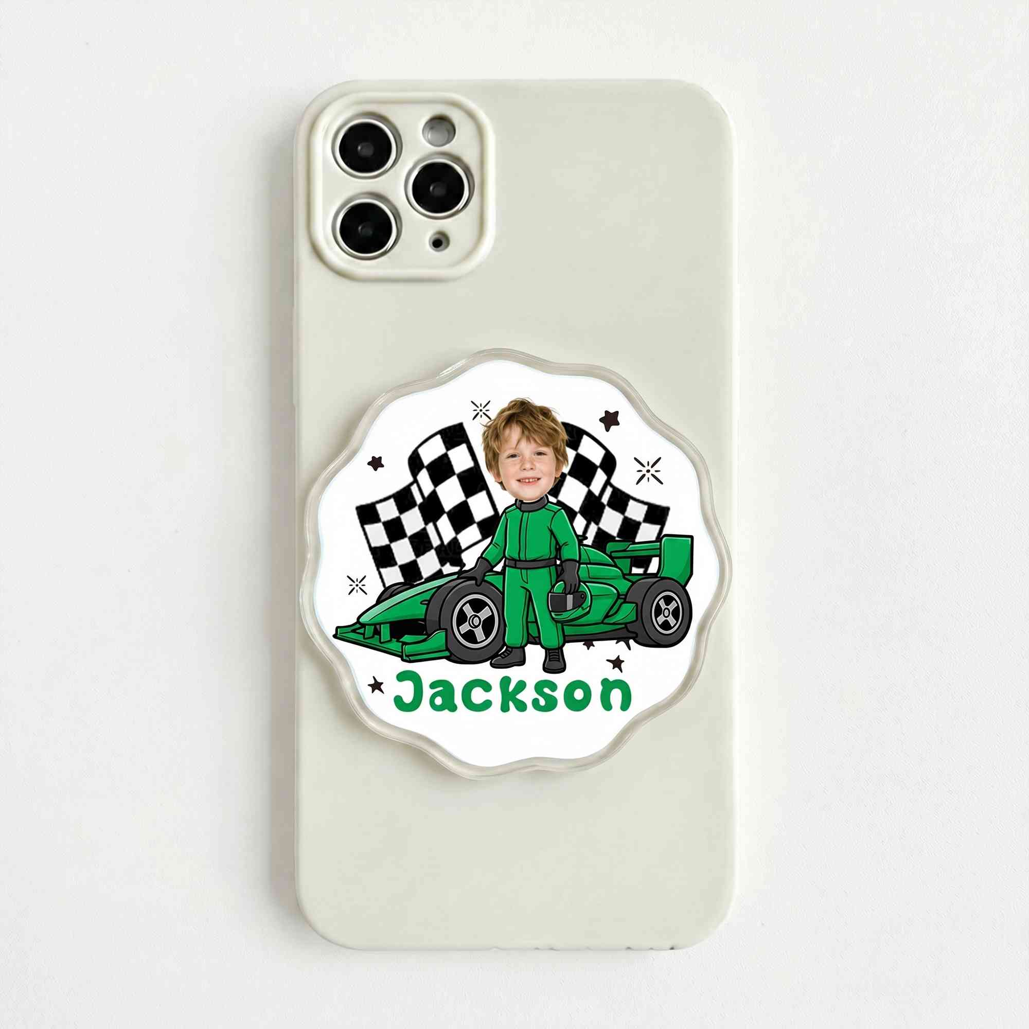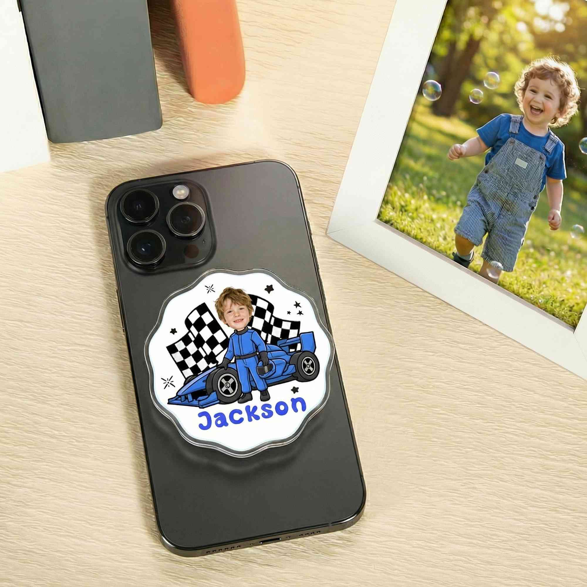 Custom Name & Photo - Personalize this phone holder with a name and face photo to create a truly unique accessory. The customized cartoon artwork turns a simple phone grip into a meaningful keepsake that represents your individuality or celebrates someone who loves racing.