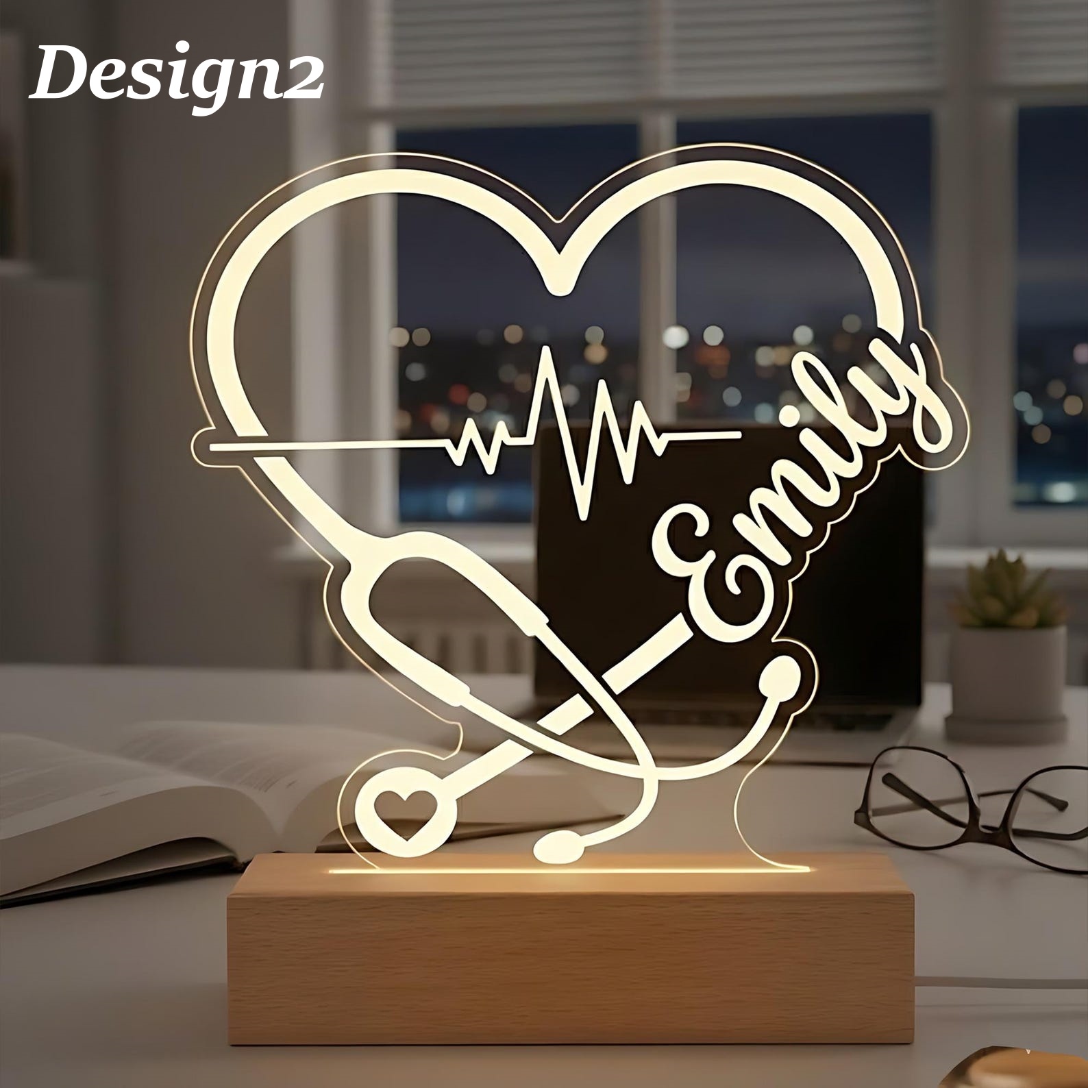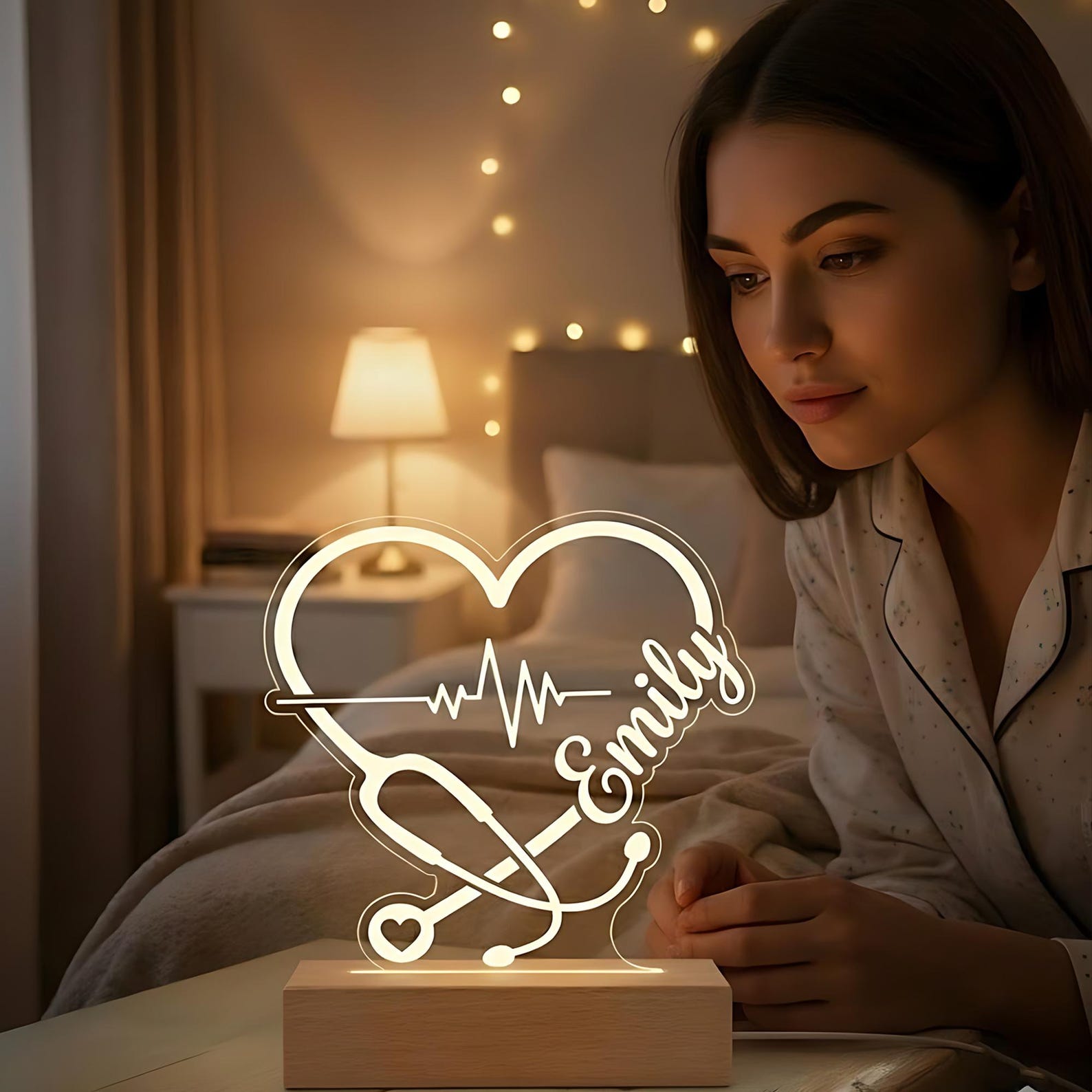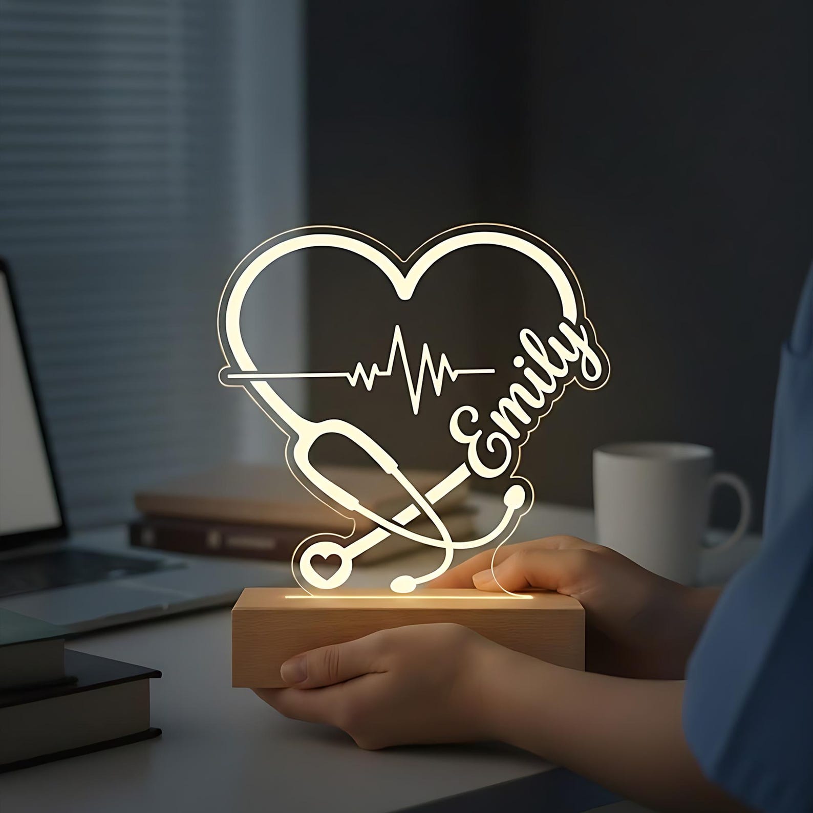 Custom Name Line Art Heart Stethoscope LED Night Light, Acrylic Night Lamp with Wooden Base, Appreciation/Graduation Gift for Nurses/Medical Staff