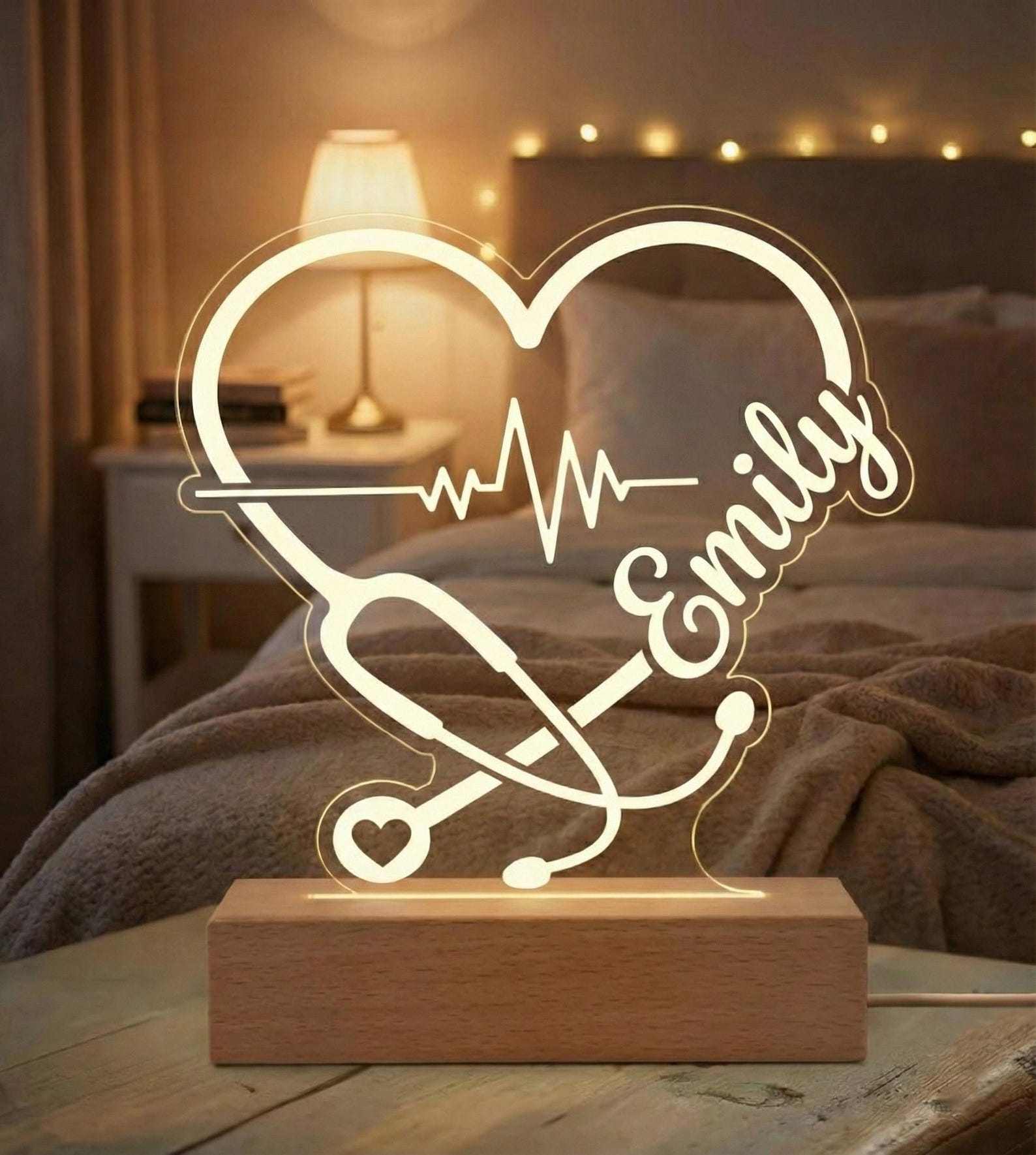 Heartwarming Medical – This elegant night light features a clean, modern line-art illustration of a stethoscope artfully wrapped around a heart—symbolizing compassion, dedication, and the life-saving love at the core of healthcare. The minimalist silhouette glows softly when lit, creating a calming.