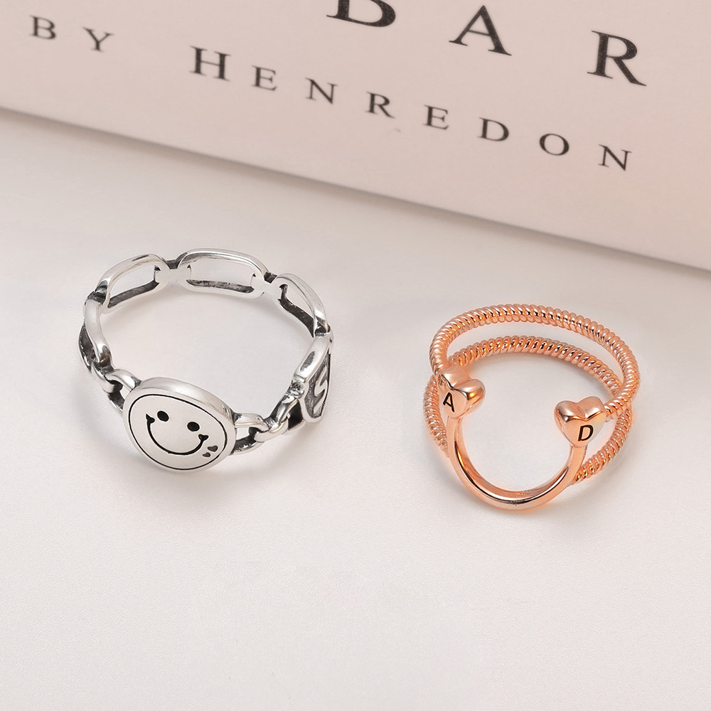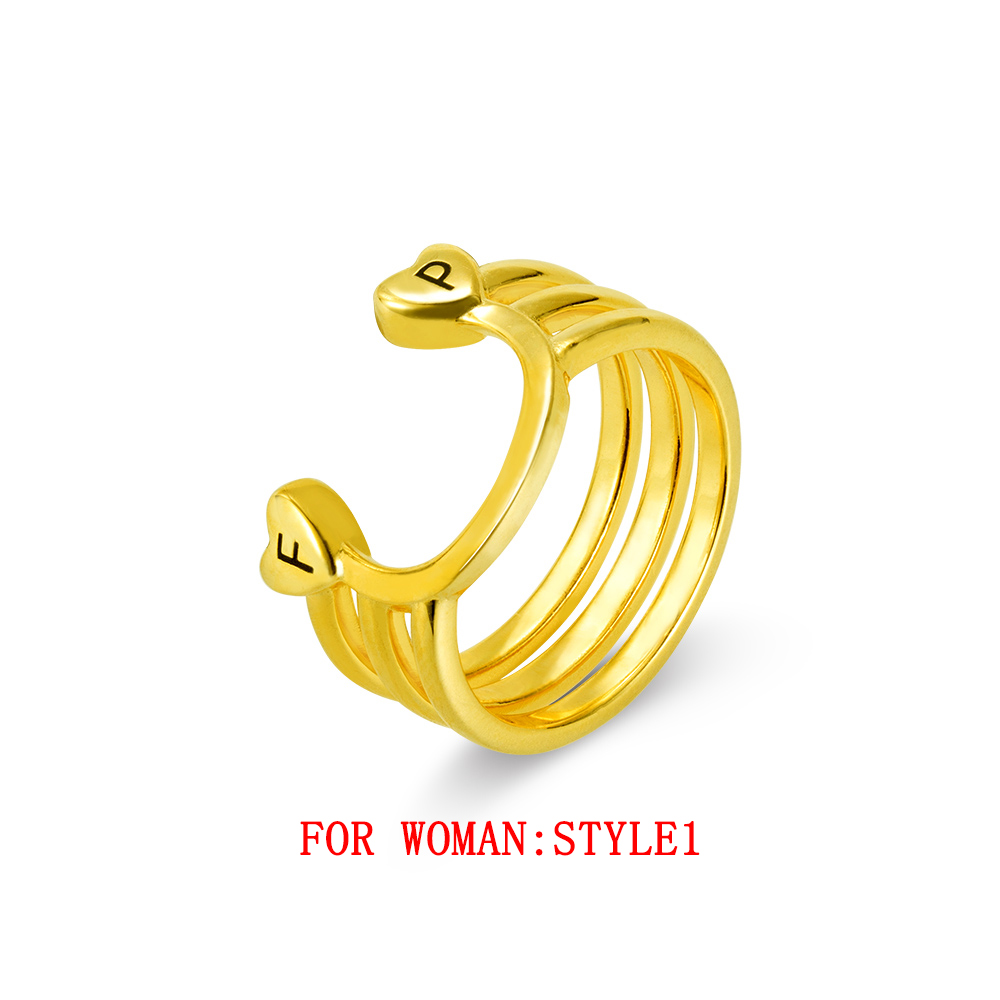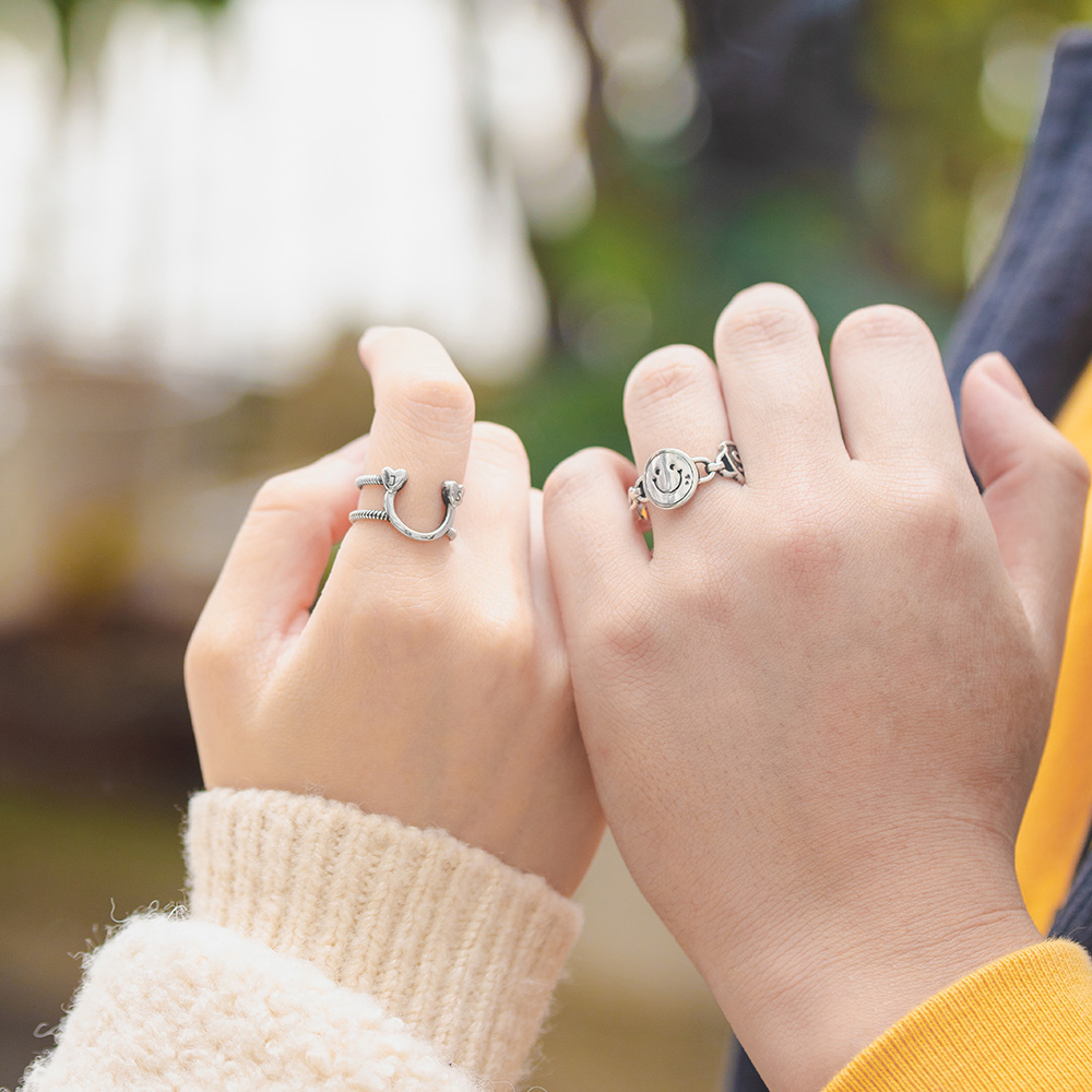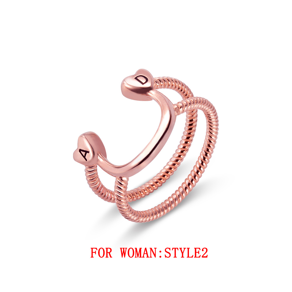 Product design: His ring is a fixed style, and her ring has two styles. One has a simple ring, and the other has a rope woven form. The front of her ring design combined with heart and curves makes it look just like a smiling face. In addition, the first letter of the couple's name can be carved on the heart. His ring uses a direct smiley symbol. In order to increase the masculinity of his ring, we used the element of the chain for it.