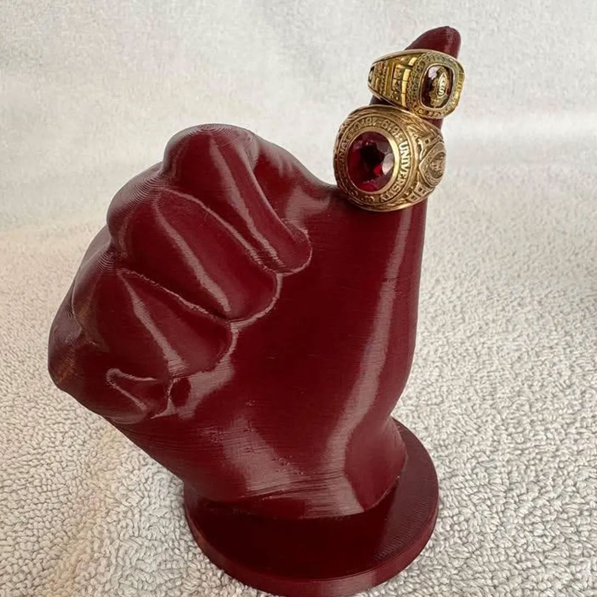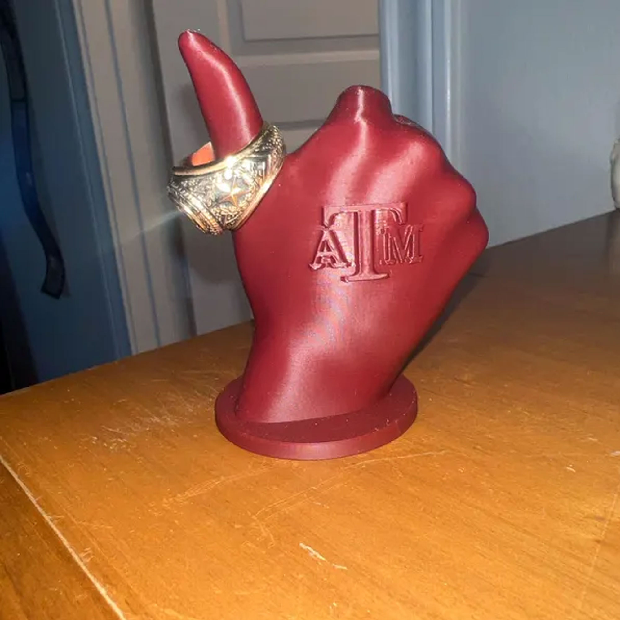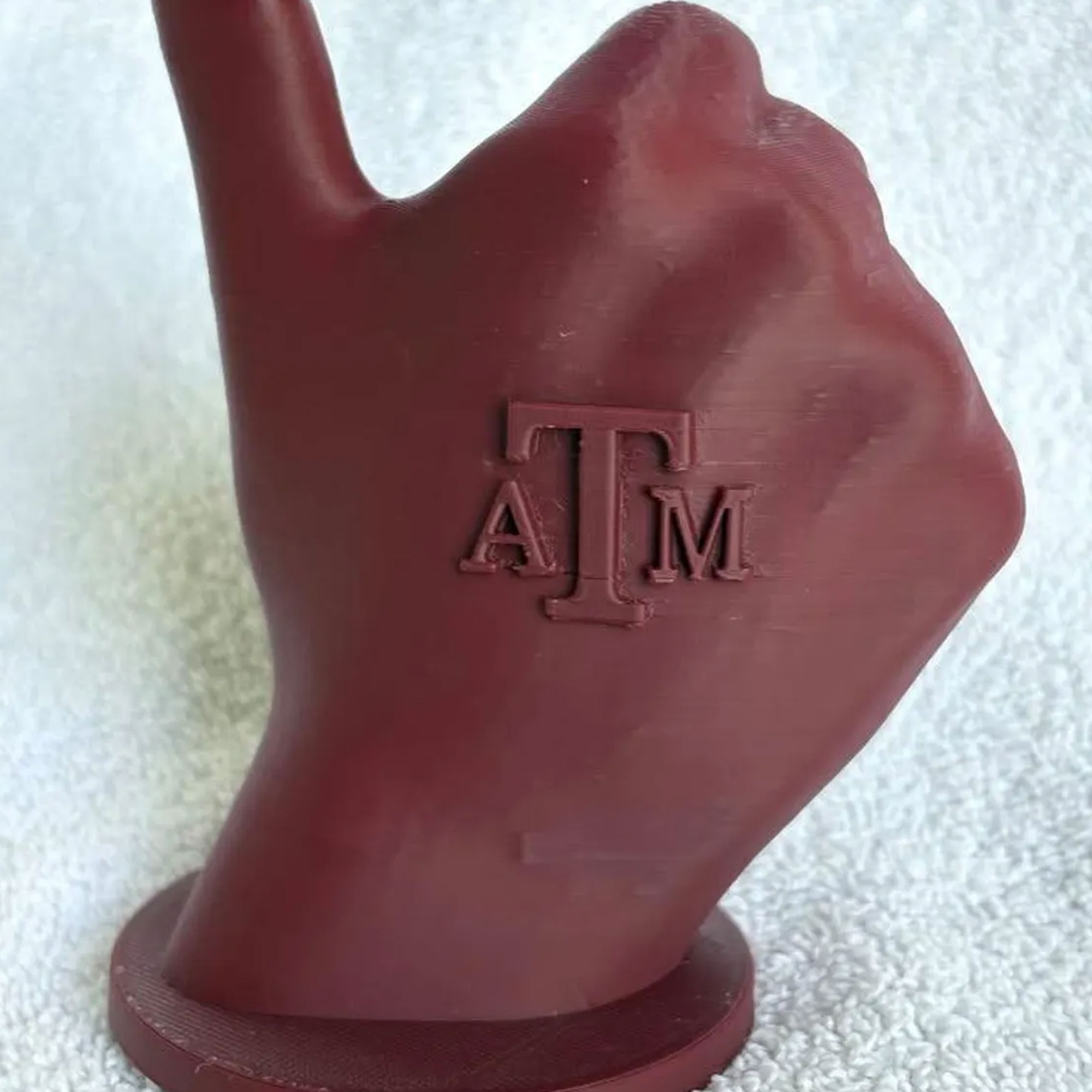 Gig Em Ring Holder – A bold 3D-printed hand in team colors, shaped into the iconic “Gig ‘Em” gesture. Perfect for displaying championship rings, class rings, or sentimental jewelry with pride.