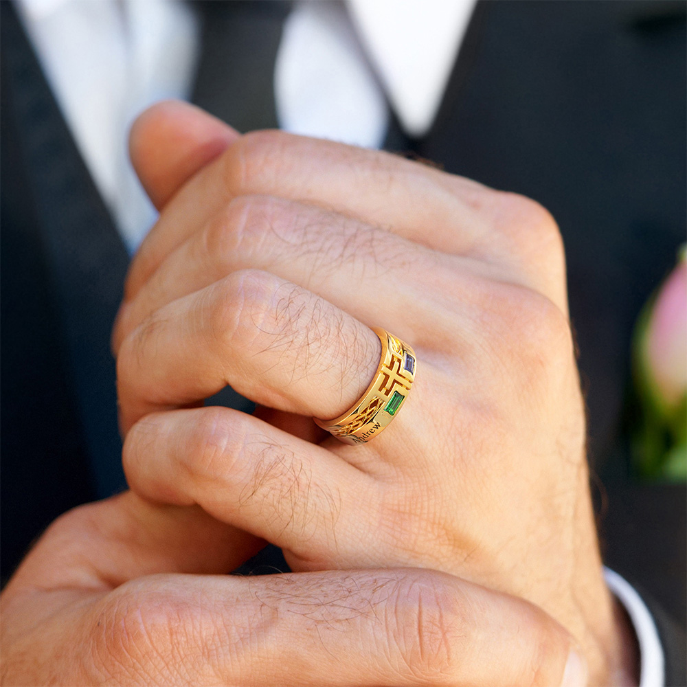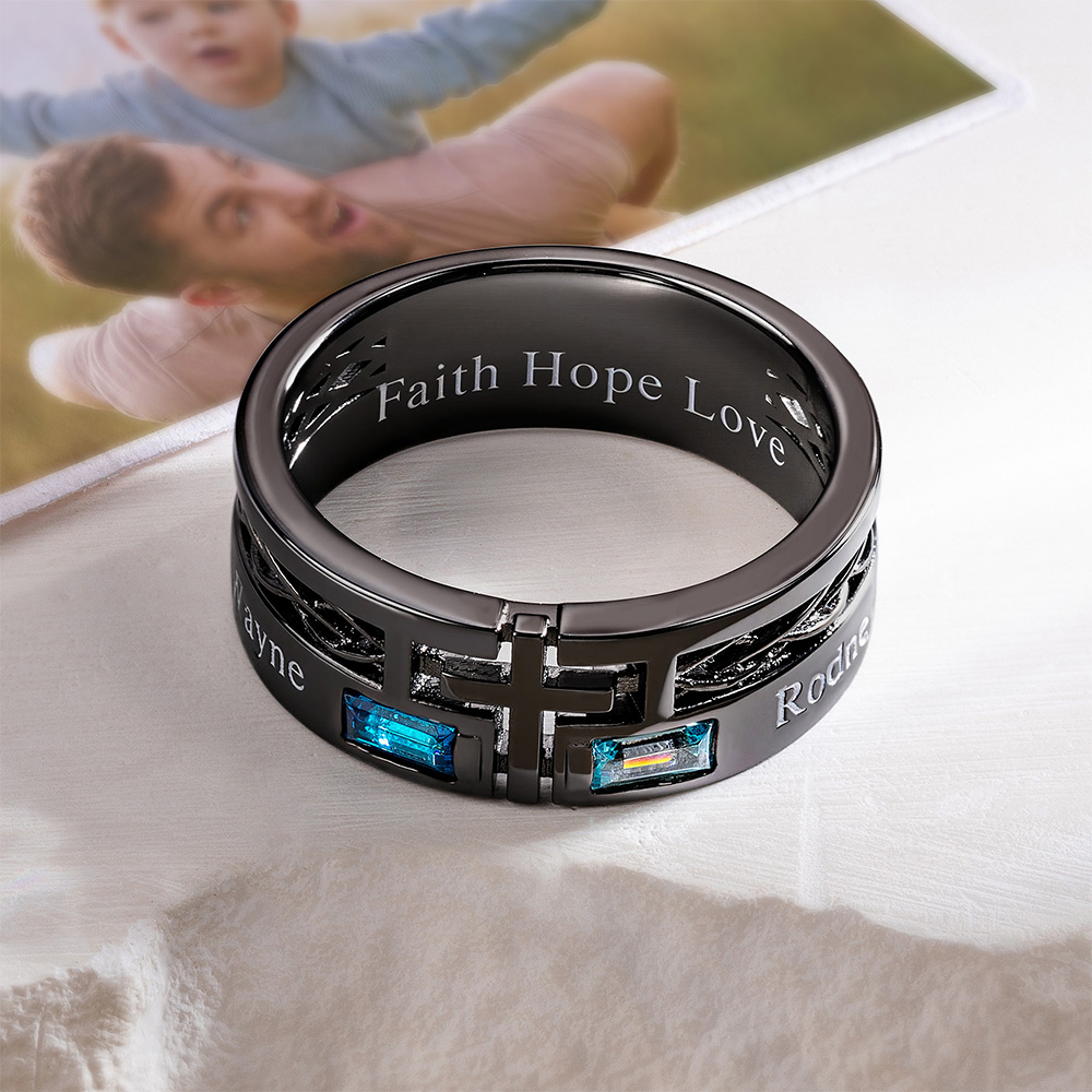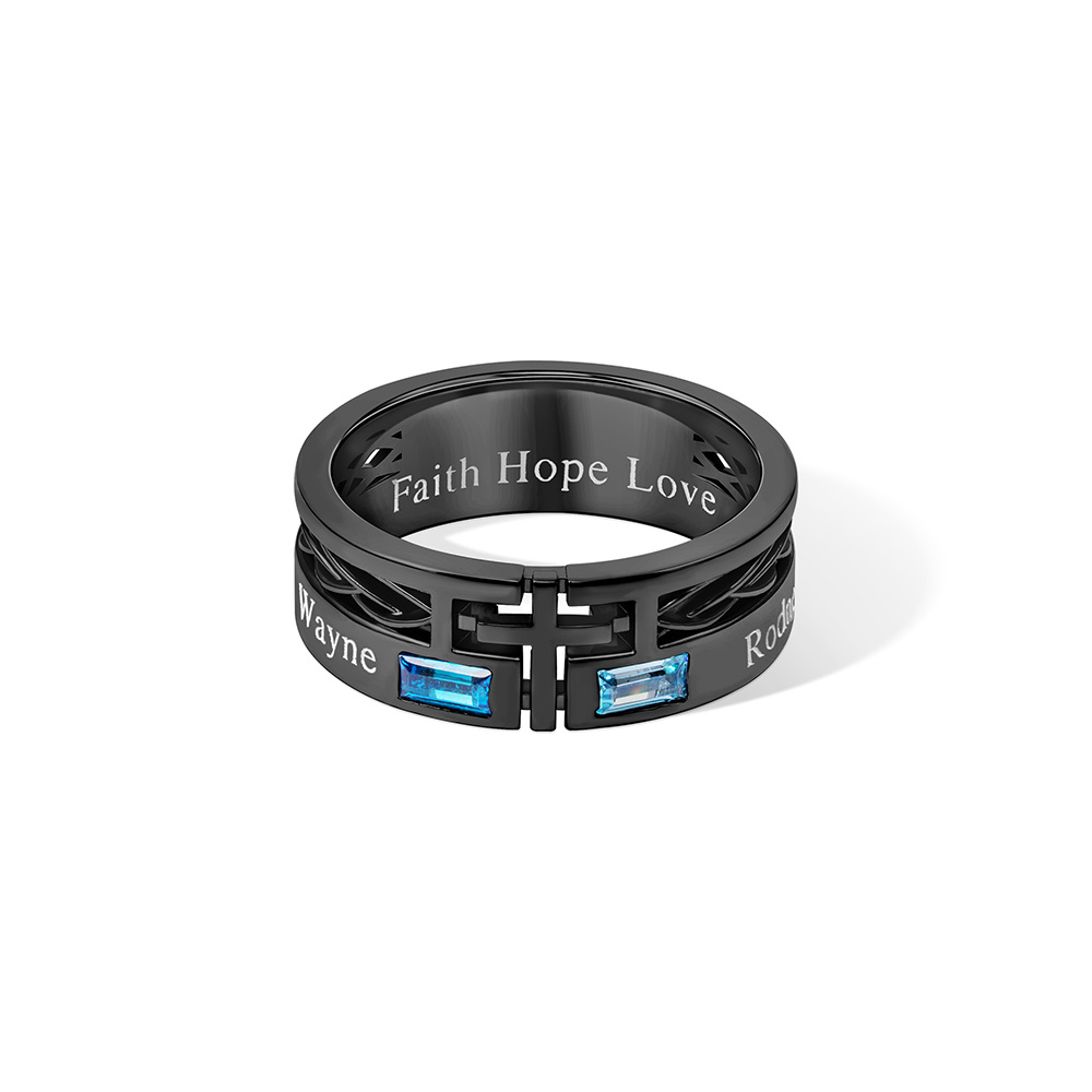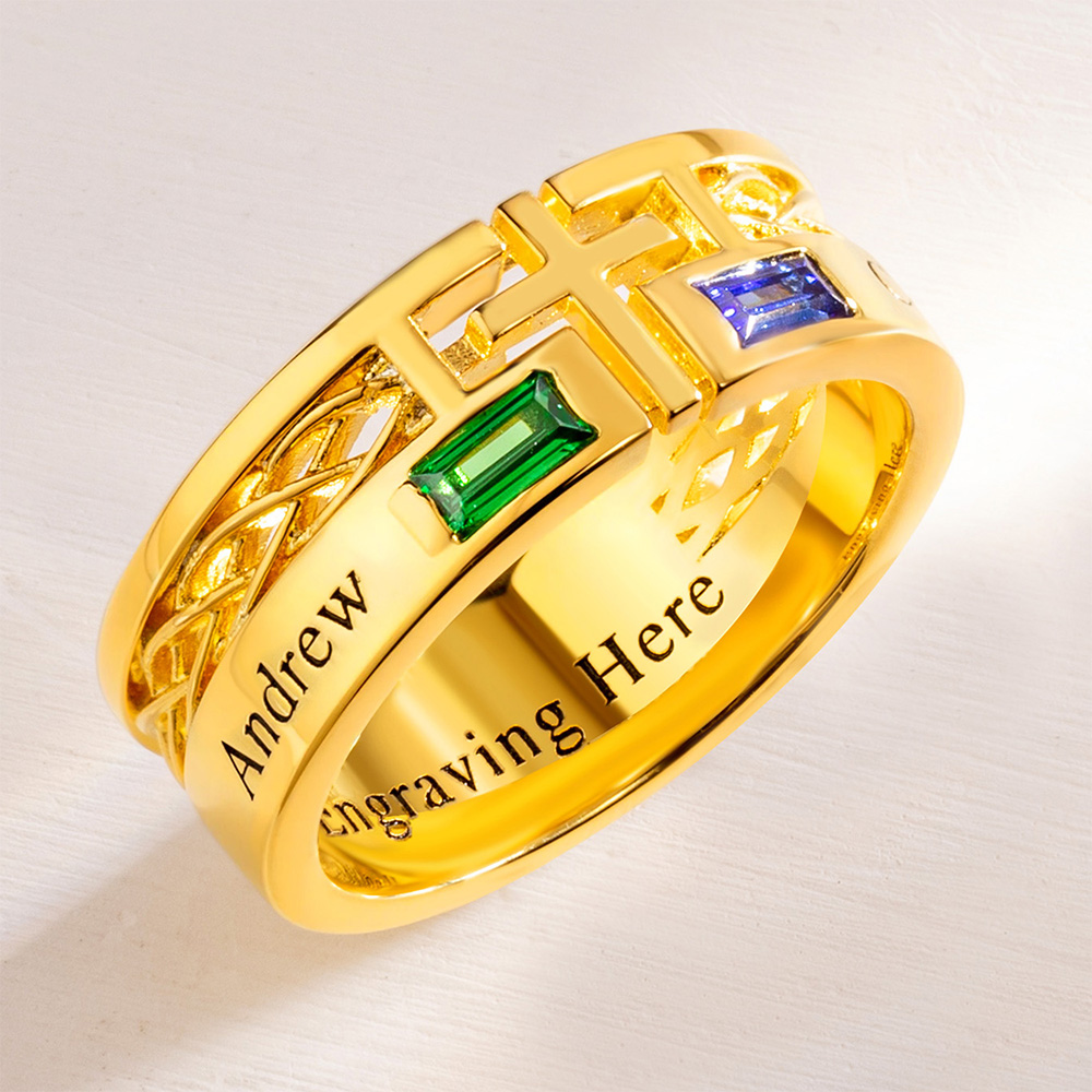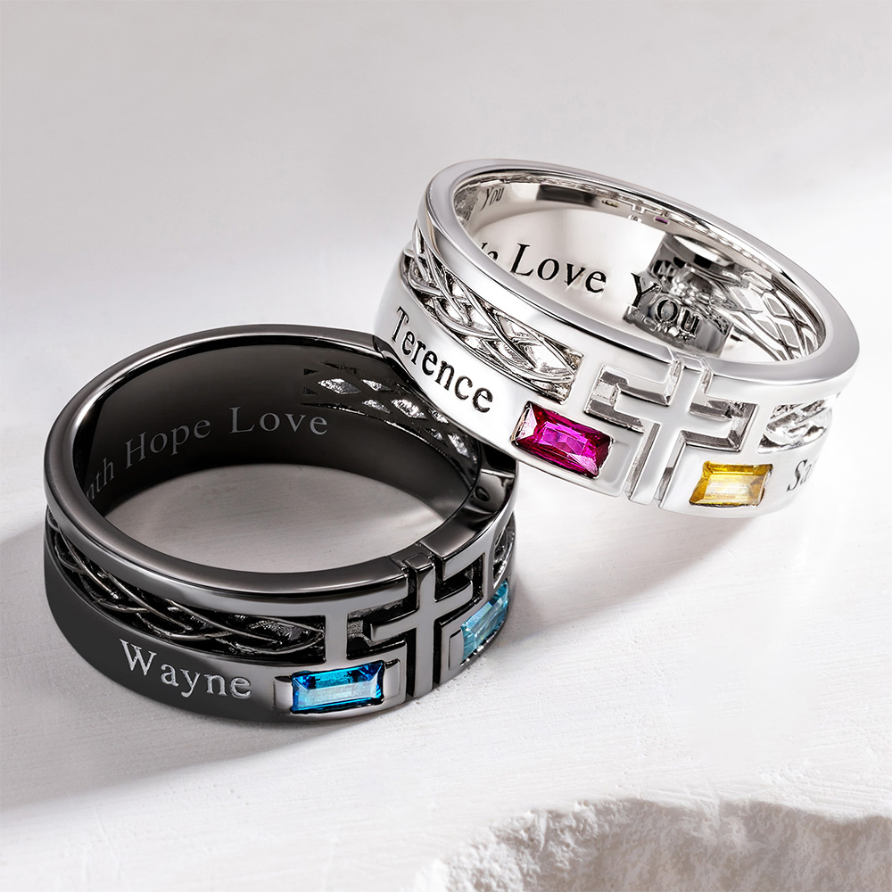 Minimalist Cross Design - This men's faith ring features a sleek and modern cross design, combined with baguette-cut birthstones for a meaningful and stylish look. The clean lines and minimalist style suit both casual and formal wear, offering a refined expression of faith.