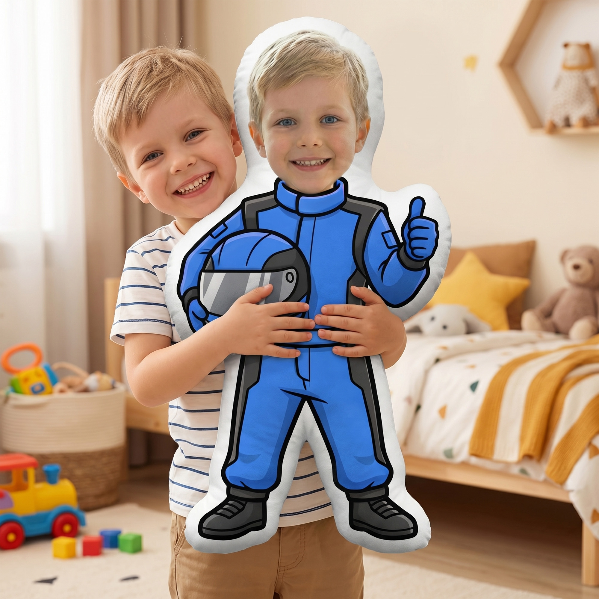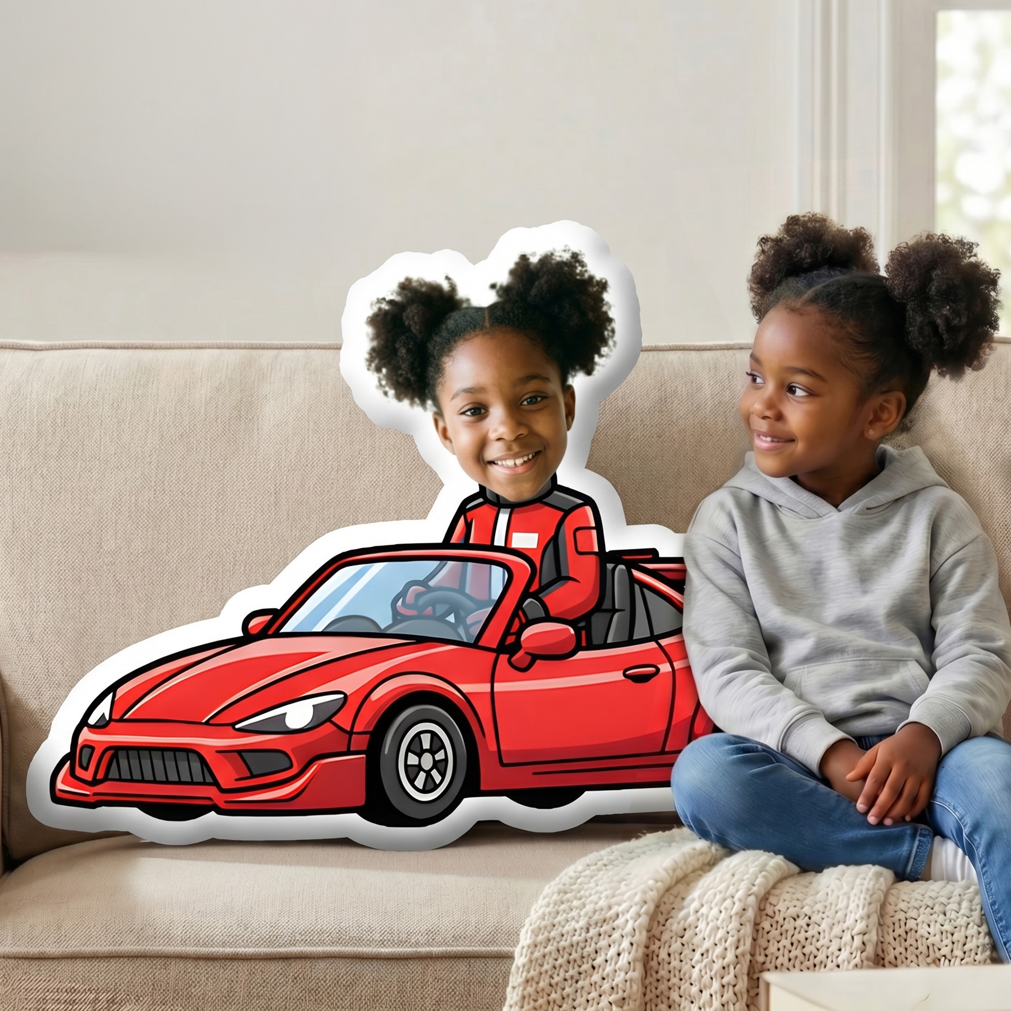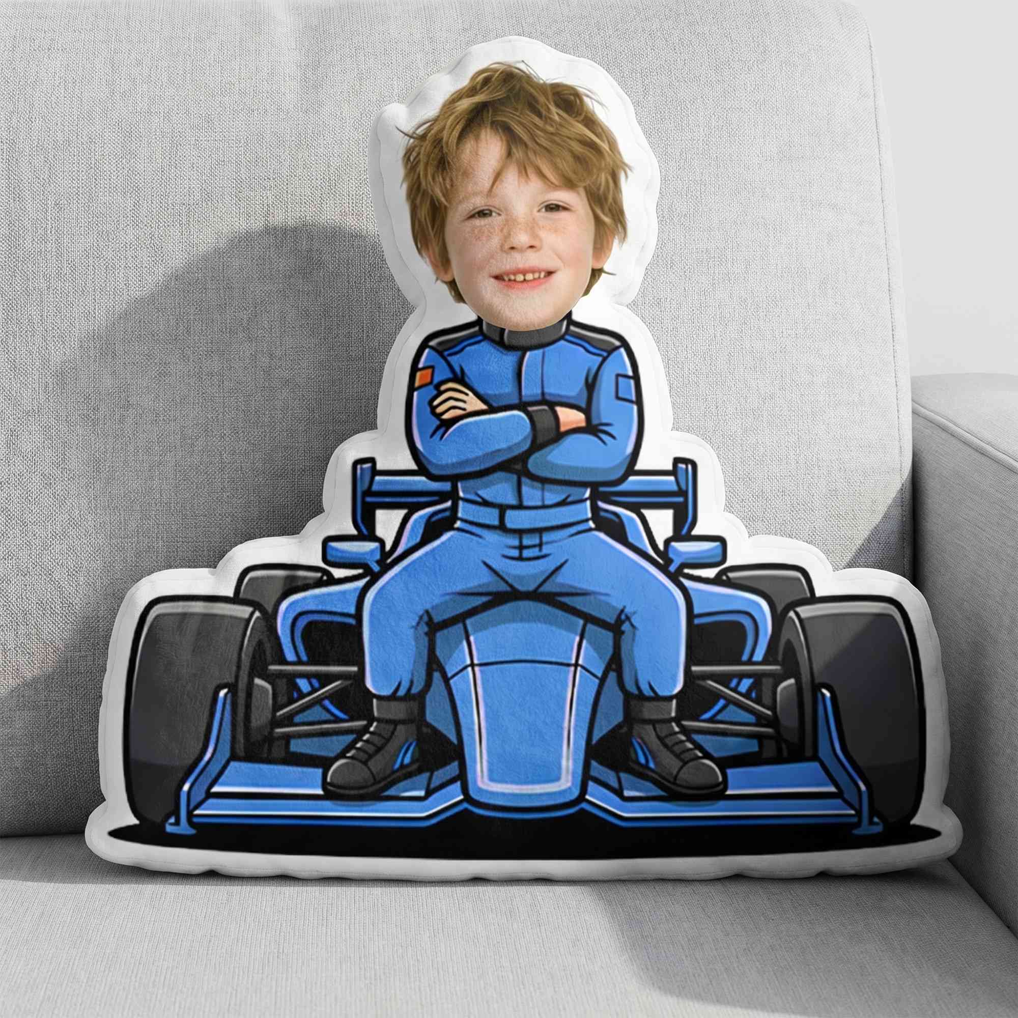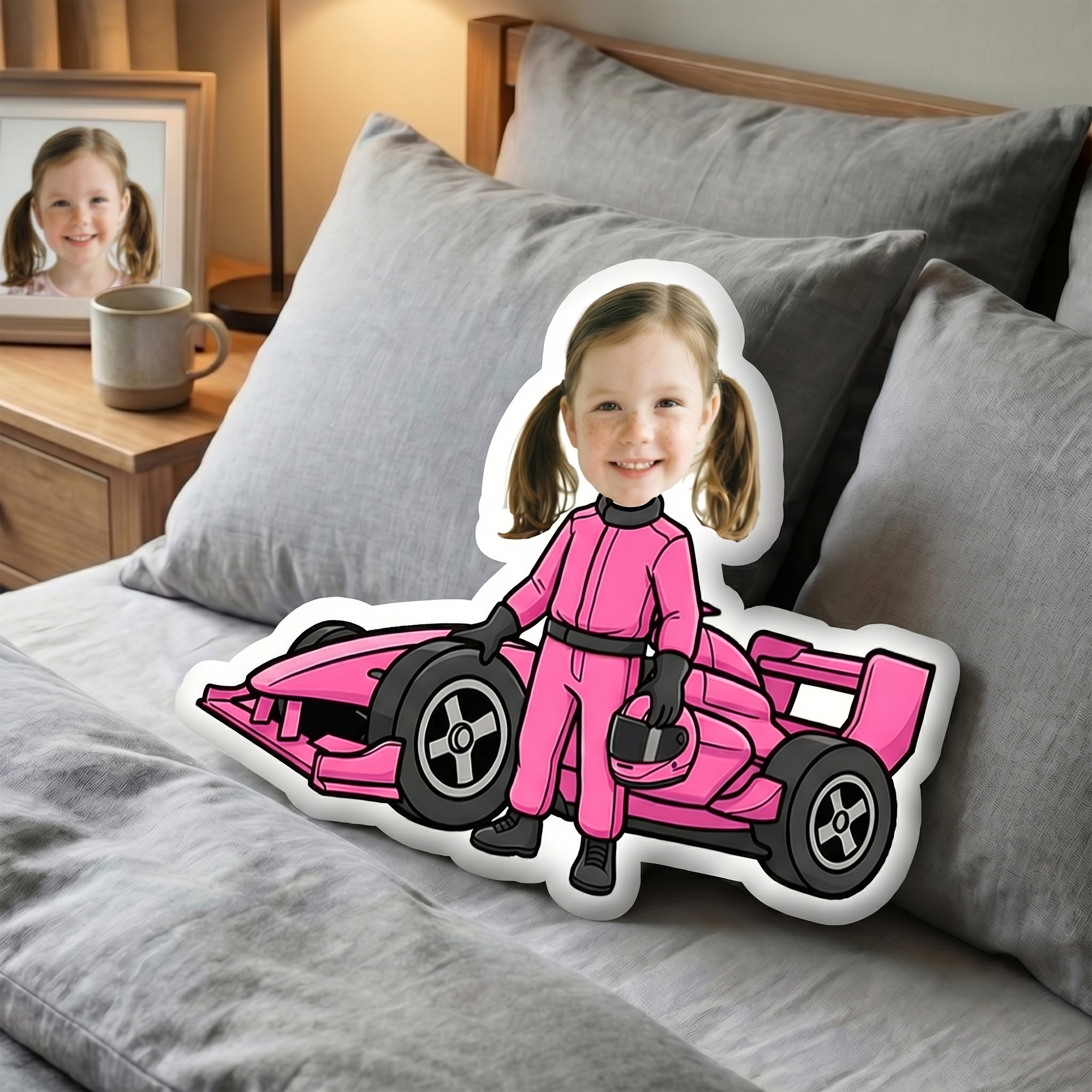 Racing Character Design - This personalized throw pillow features a playful racing driver cartoon shape created from your favorite face photo. The colorful race car theme and adorable 3D design bring energy and personality to any room, making it a standout decor piece for racing fans of all ages.