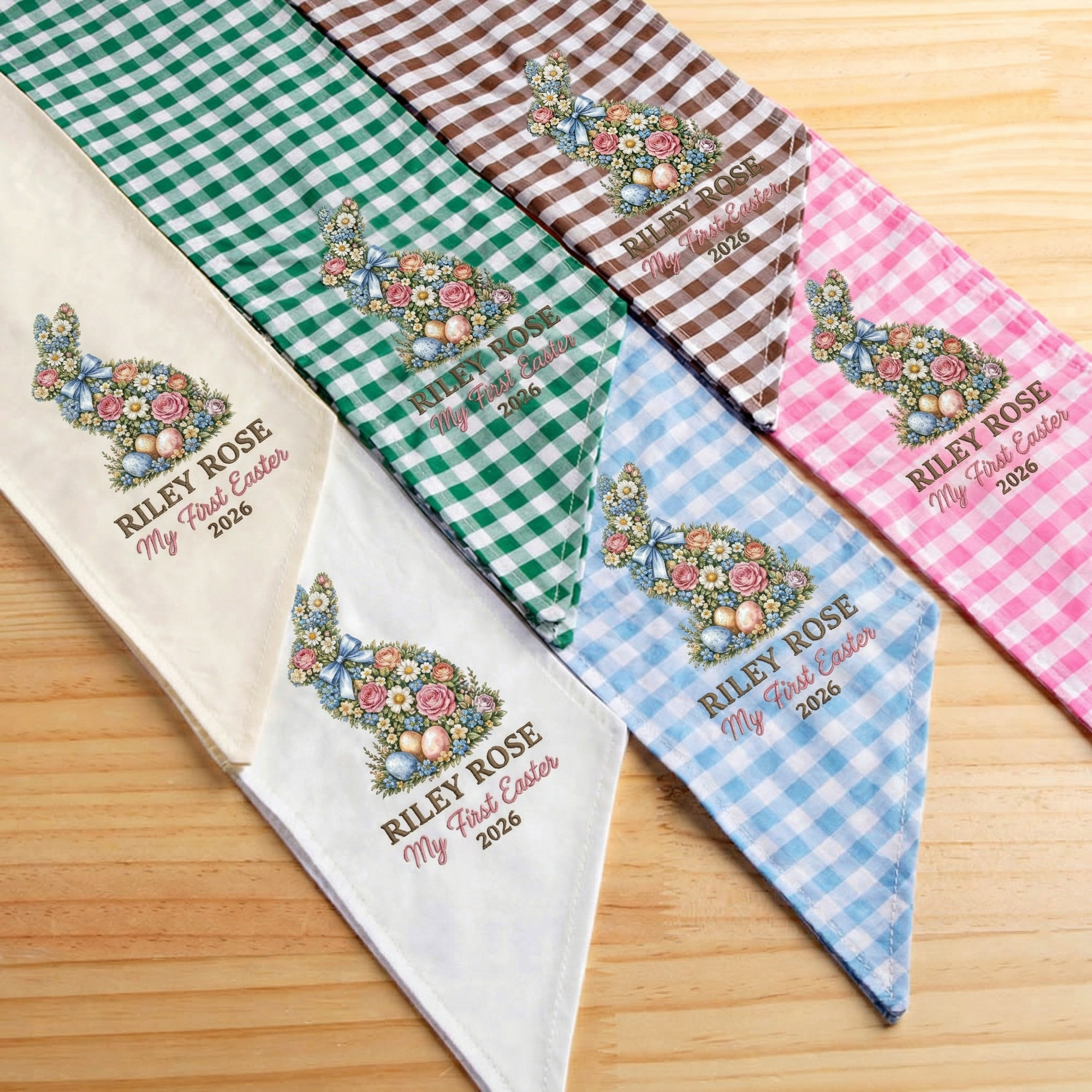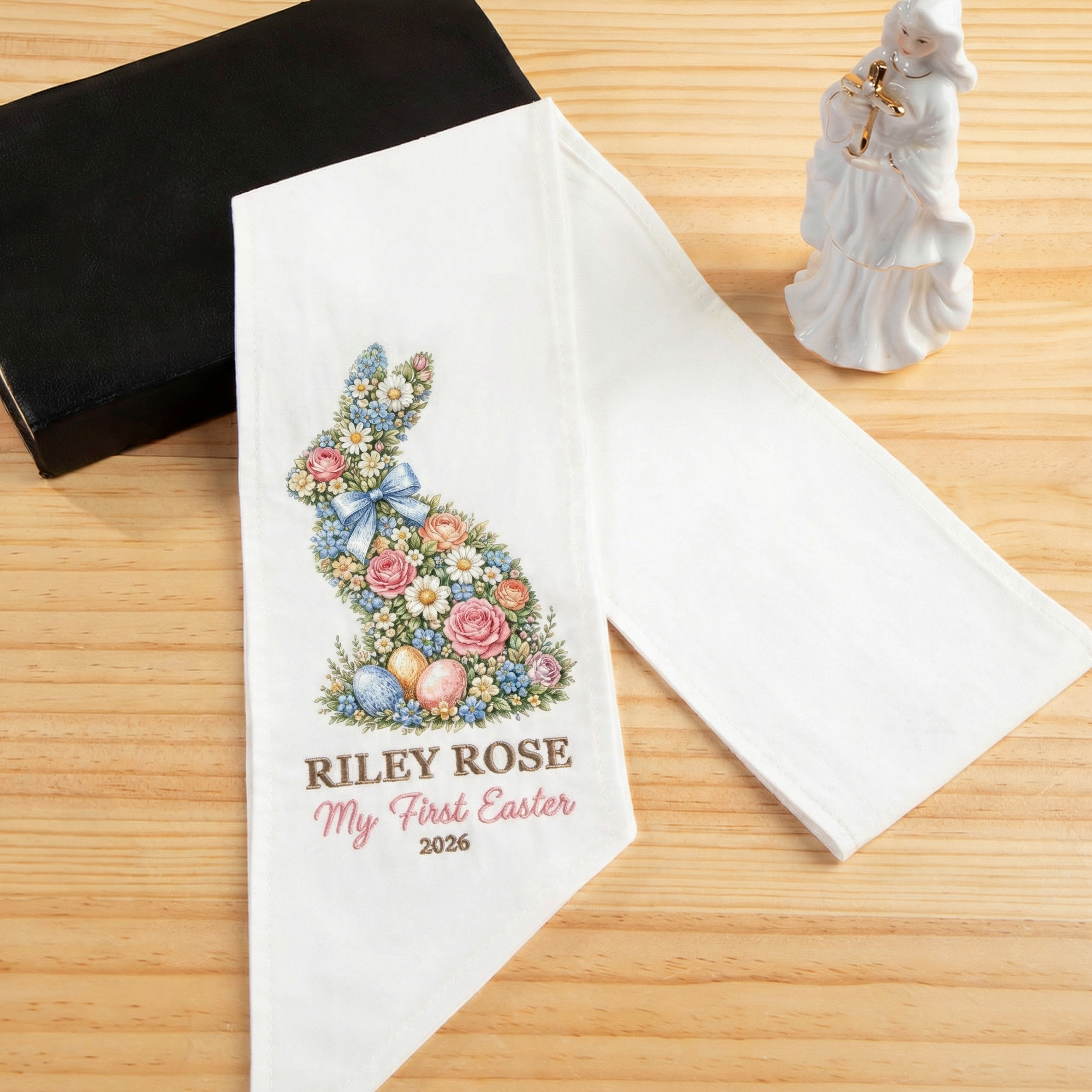 Handcrafted with care, this bow features soft, high-quality cotton in gentle pastel hues. The centerpiece includes a charming bunny illustration and a custom name, beautifully embroidered for a lasting finish. Lightweight and gentle, it's safe for all-day wear during Easter egg hunts, church services, or family portraits.