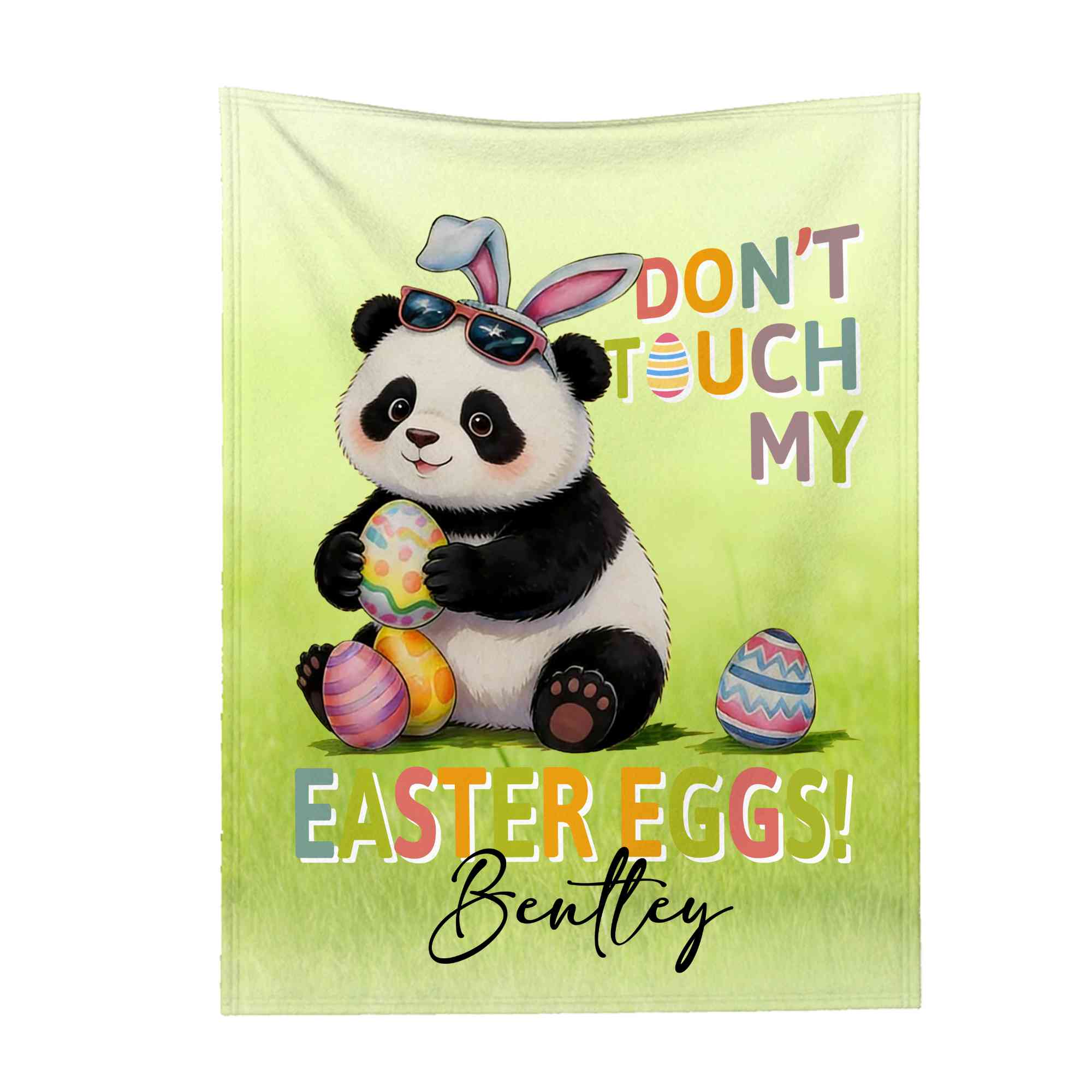 Bunny Ears Animal Design - This blanket features a fun “Don’t Touch My Easter Eggs” quote paired with a cute bunny ears animal and colorful egg details. The animal theme and the bold name display give it a lively, kid-friendly style that stands out in any bedroom or playroom.
