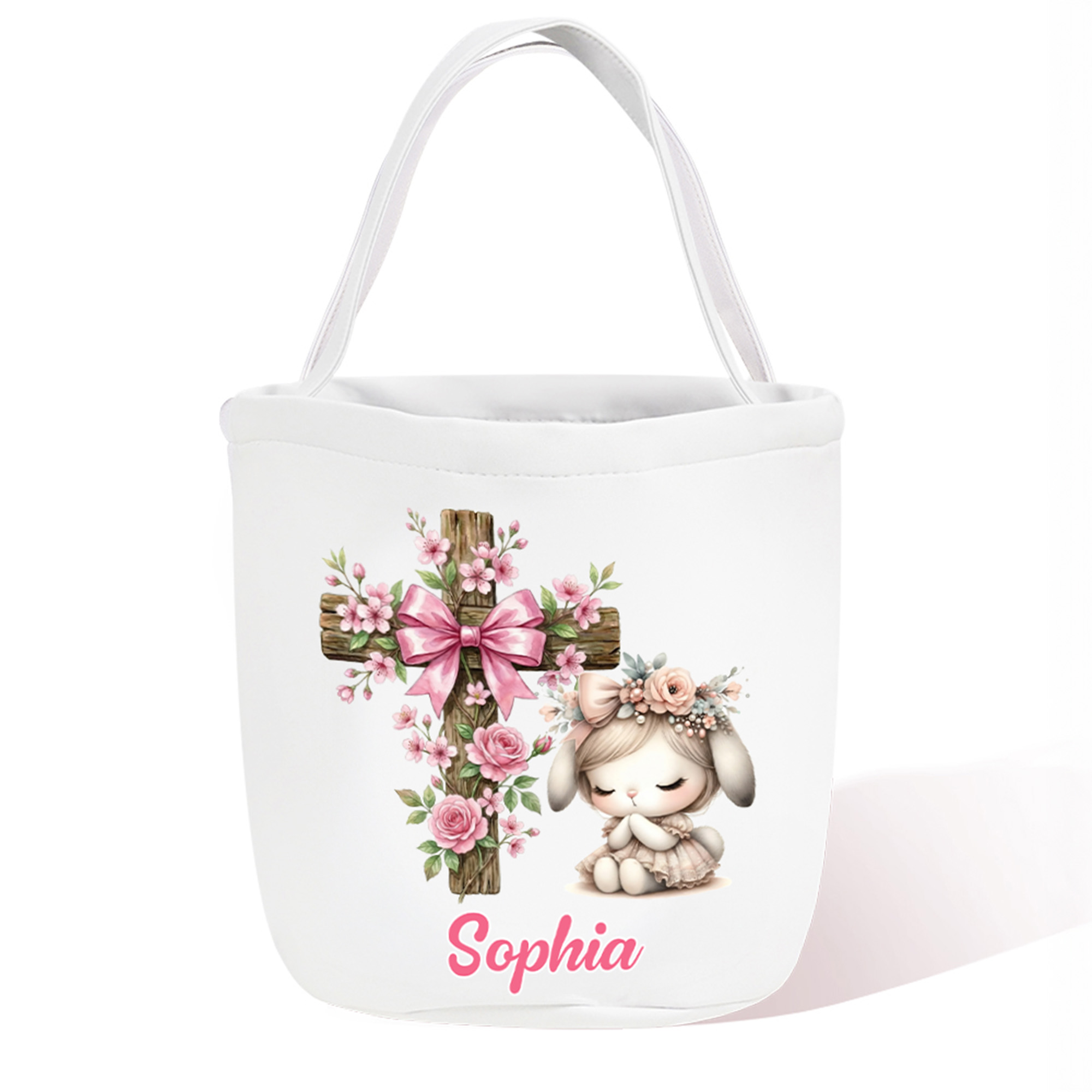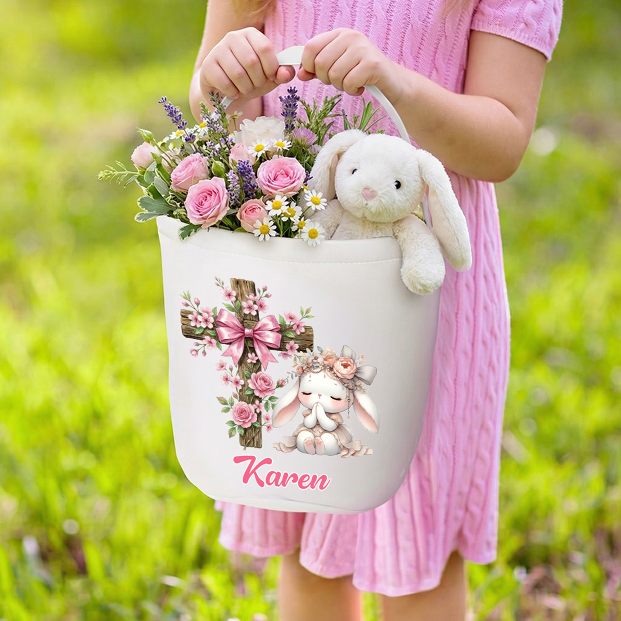 Personalized Name Floral Bow Cross & Player Bunny Easter Basket, Easter Egg Hunt Bucket Bag, Large Capacity Canvas Goodie Bag, Easter Gift for Kids