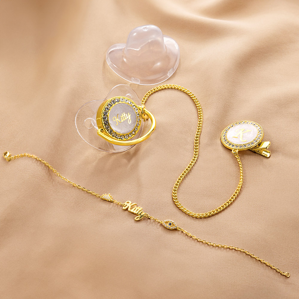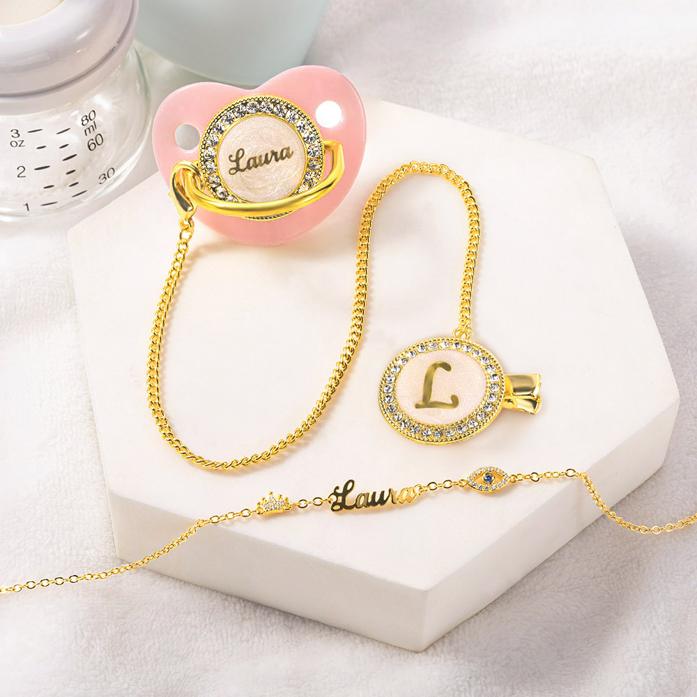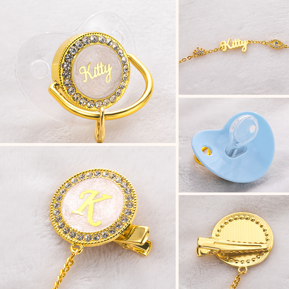 Personalized Design - This pacifier holder clip set (pacifier, pacifier clip, bracelet) can be customized with your baby's name, adding a personal and unique touch to your little one's essential accessory.