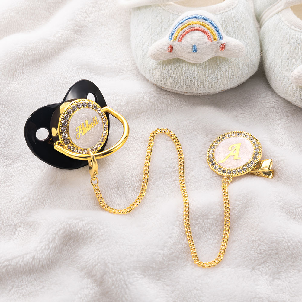 Personalized Name Pacifier Holder Clip Set, BPA Free, Custom Silicone Soother for 0-6 Months Newborn Girls/Boys/Preemie, Gold Luxury Gifts for Baby