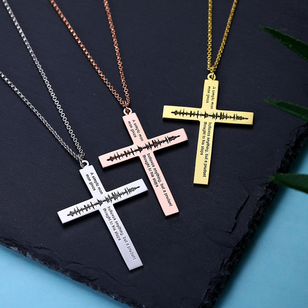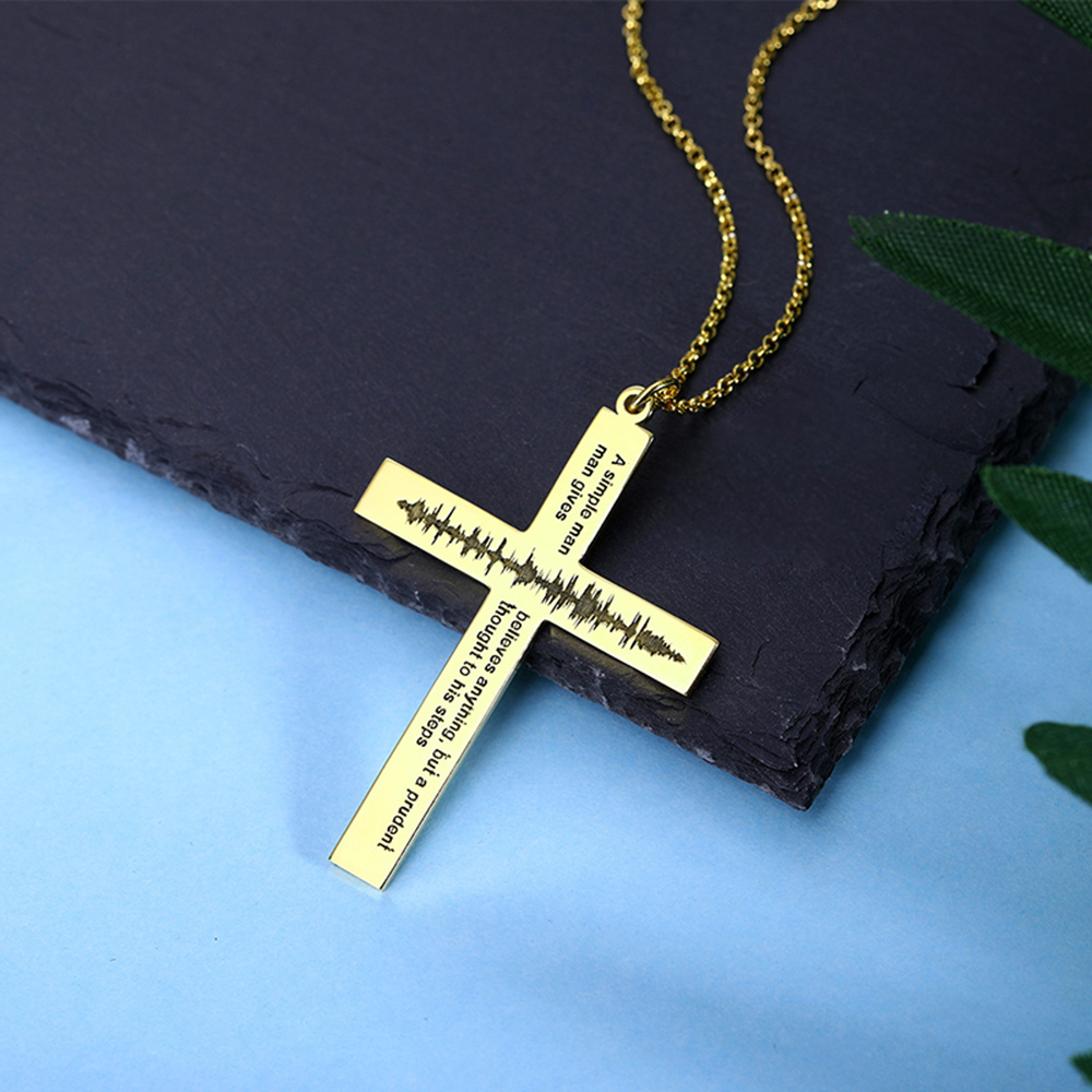 Your voice can be kept in a new way with this unique corss soundwave necklace. We focus on making things that related to your personality more special and tangible. Upload your audio file or soundwave image, or just do it more convenient by recording your voice with our online recorder.